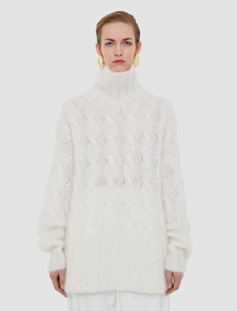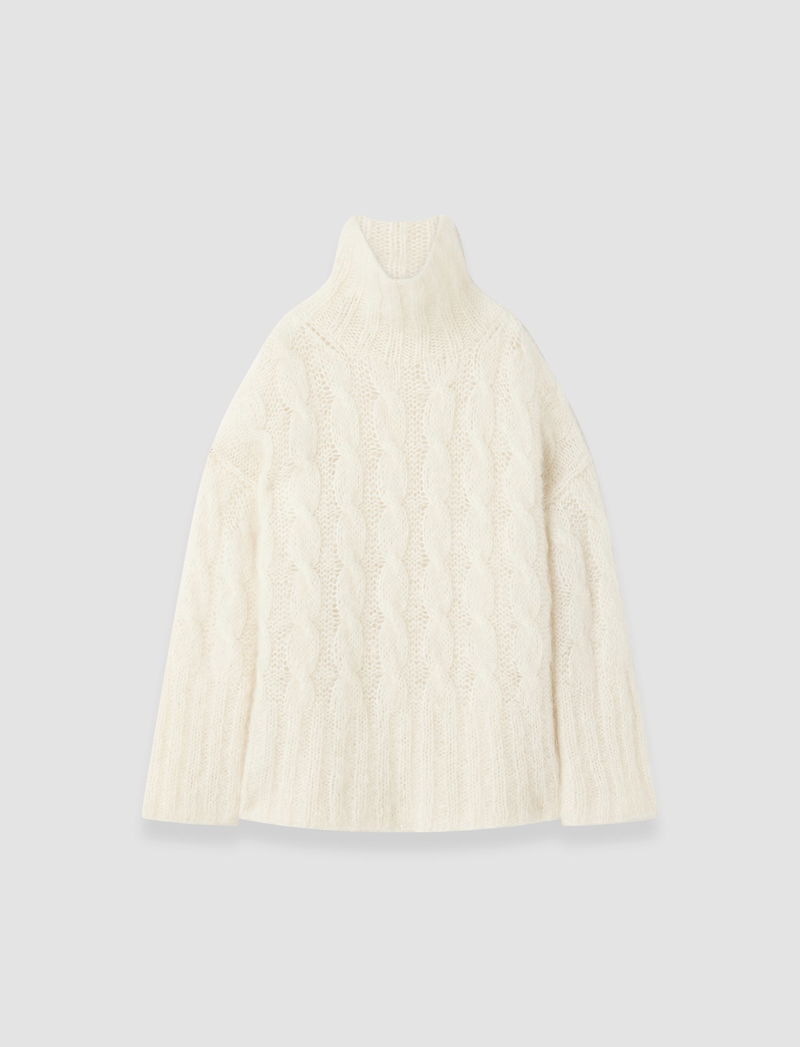 The Fortin Cable Mohair Jumper is an oversized style, expertly hand knitted from a blend of wool and mohair. This luxurious, tactile piece features a timeless cable knit pattern with a brushed texture. Offering warmth without weight, its loose knit delivers lightness and sheerness for an elegant look.