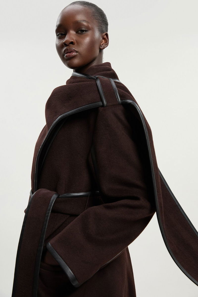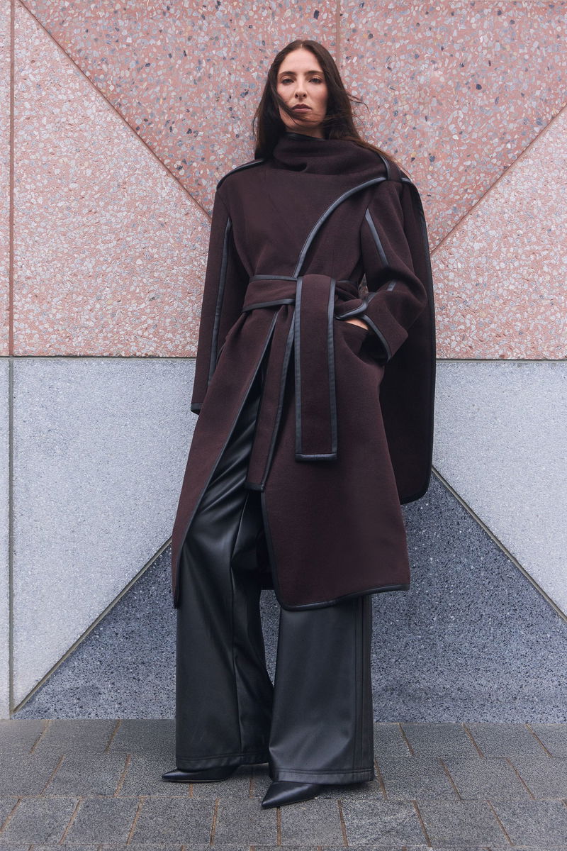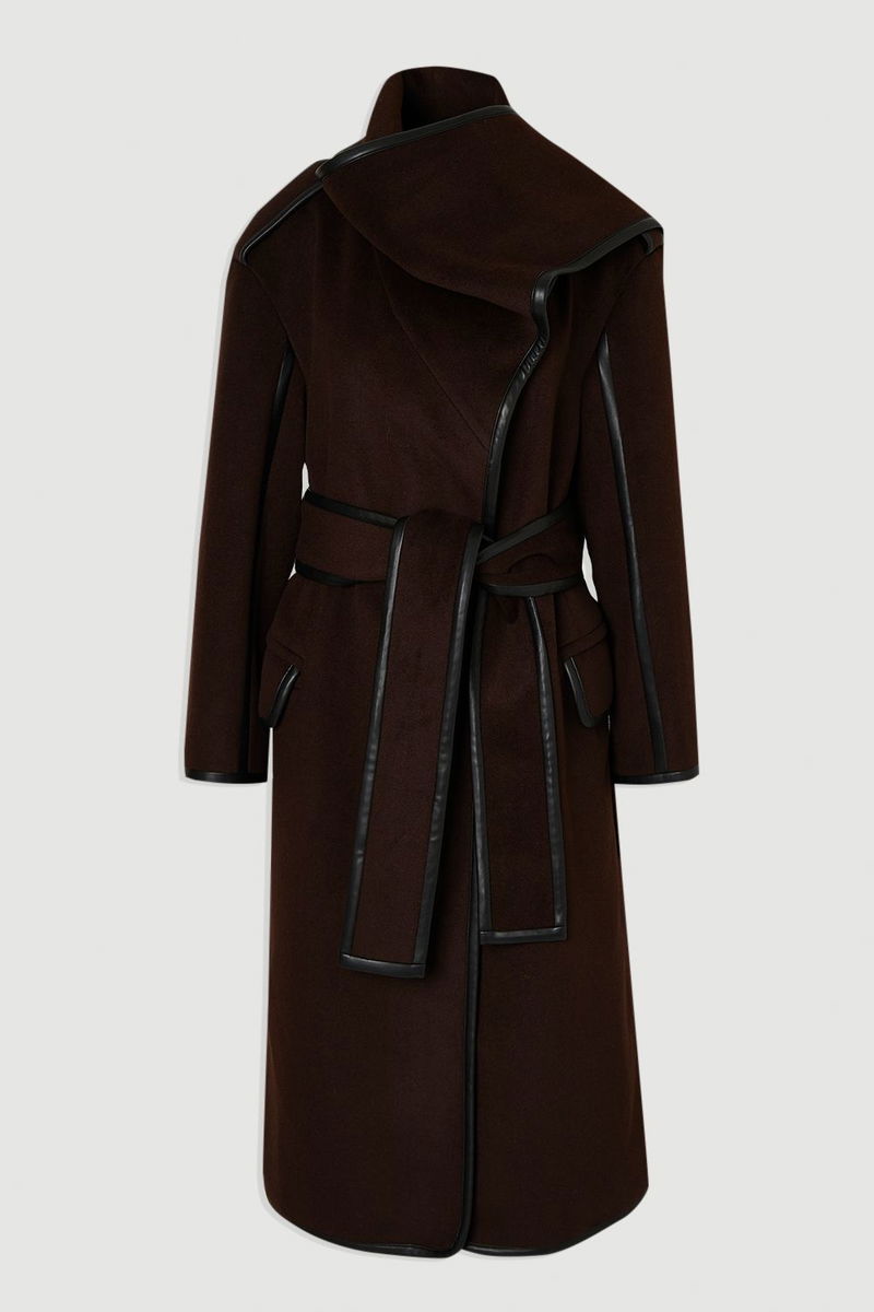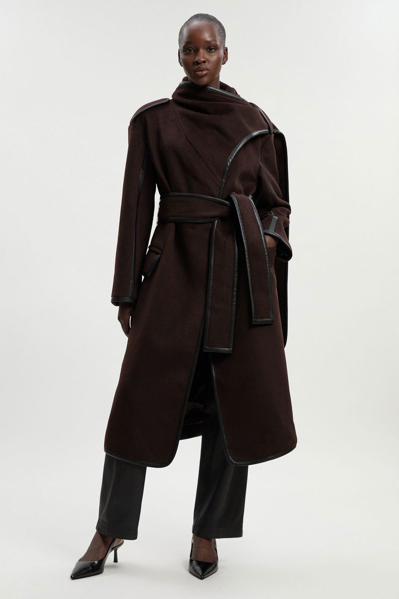 Brushed Wool Pu Mix Scarf Neck Belted Tailored Maxi Coat