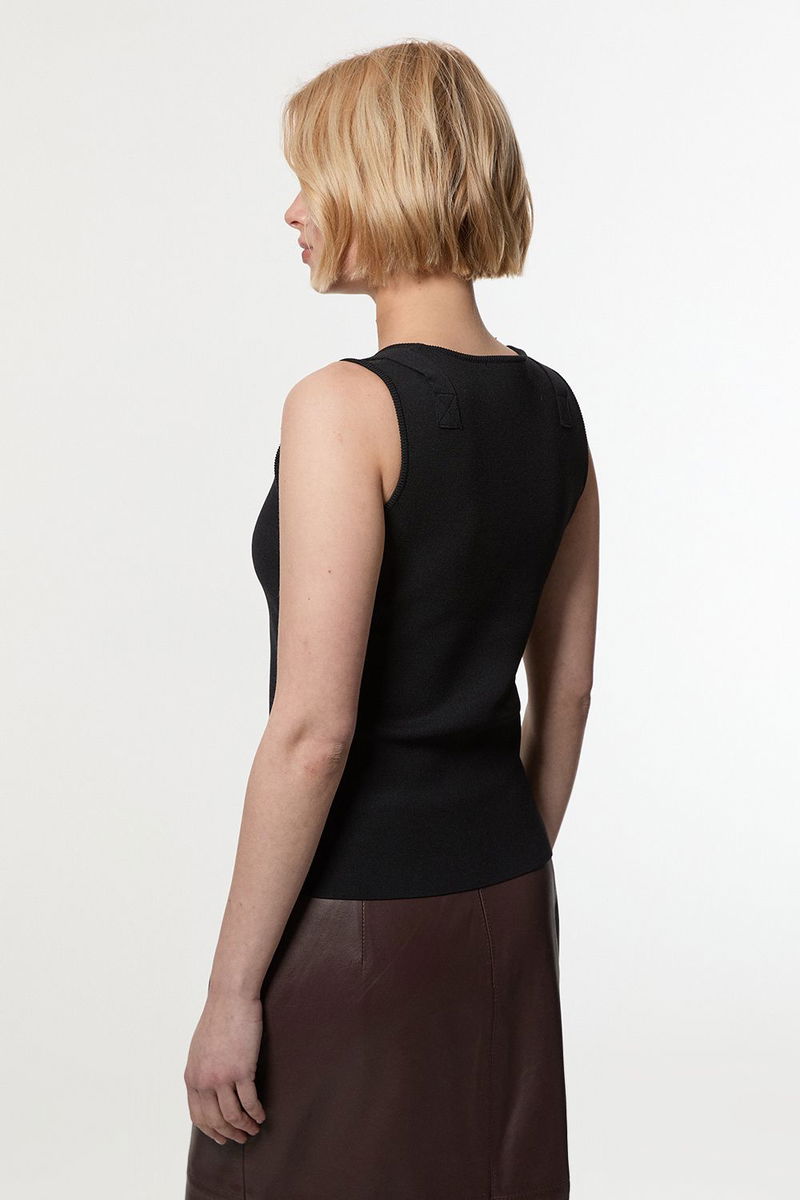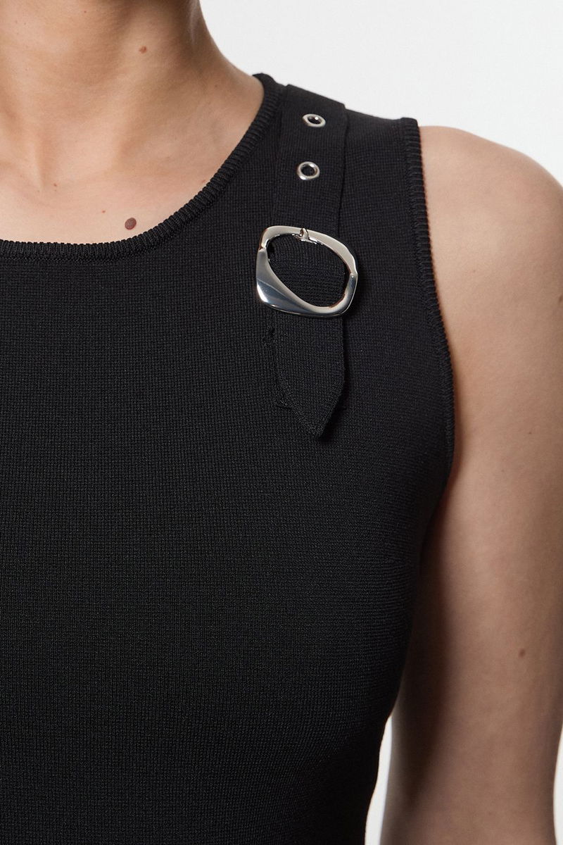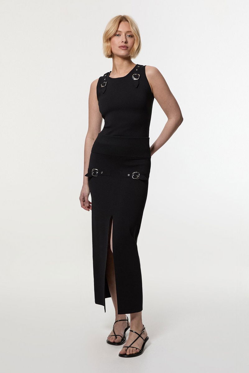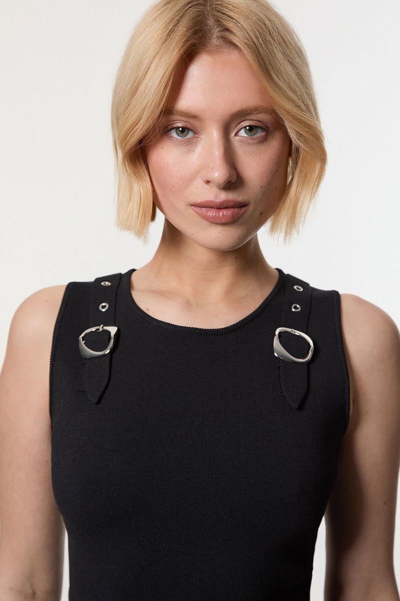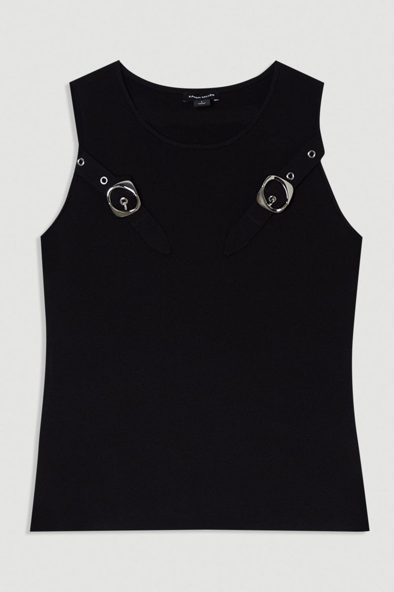 This Karen Millen buckle trim knitted top combines contemporary design with everyday wearability. The distinctive metallic buckle details at the shoulders add a modern edge to this otherwise classic piece, creating a subtle statement that works for daytime occasions. This top transitions effortlessly from casual weekend plans to office settings, offering the perfect balance of comfort and polish that the Karen Millen woman appreciates in her carefully curated wardrobe.