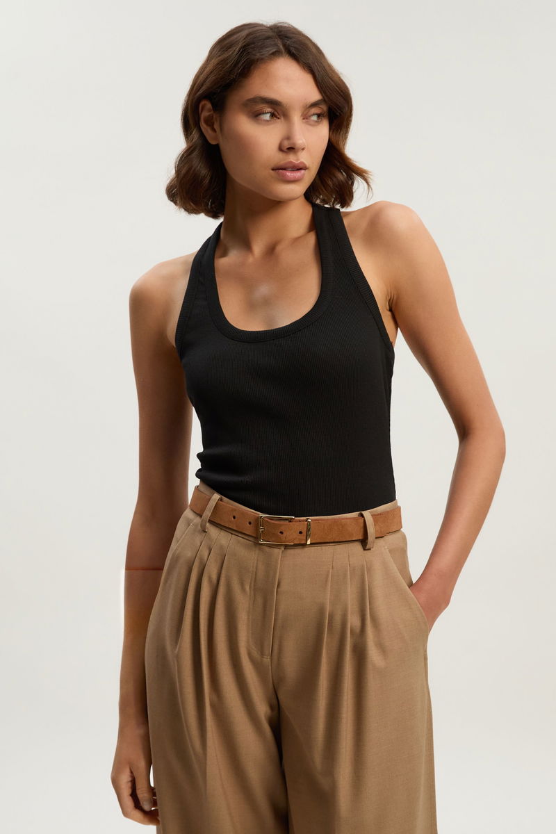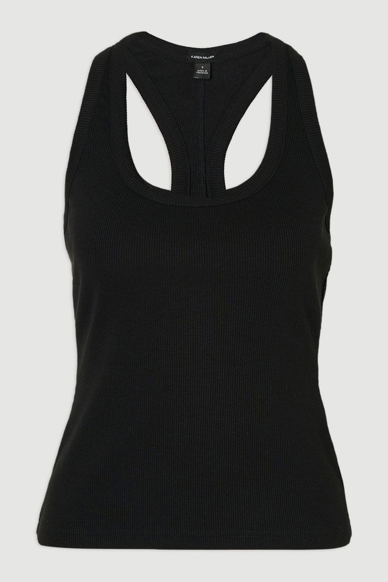 The Karen Millen Compact Jersey Ribbed Racer Back Vest combines timeless design with modern functionality. The athletic-inspired racer back creates a striking visual element whilst offering unrestricted movement for all-day comfort. The ribbed texture adds subtle sophistication to this wardrobe essential. For a complete summer ensemble, pair with wide-leg linen trousers and leather sandals, finishing with oversized sunglasses for an effortlessly stylish appearance that transitions seamlessly from day to evening. Racer back design with ribbed detailing Scoop neckline Regular fit Ribbed trim around neckline and arms