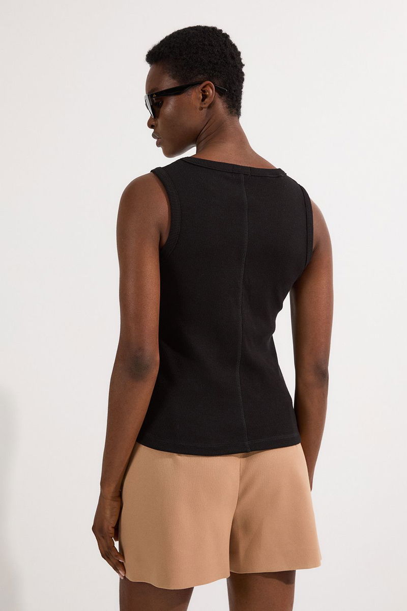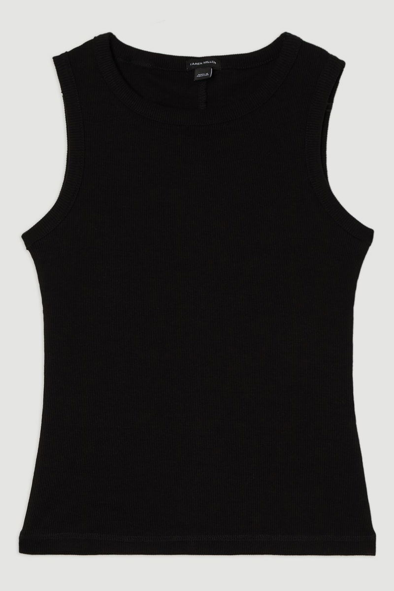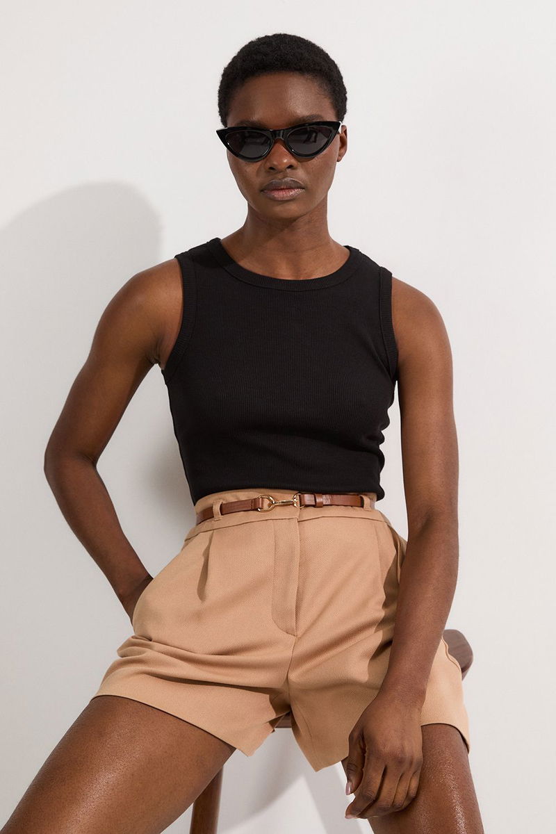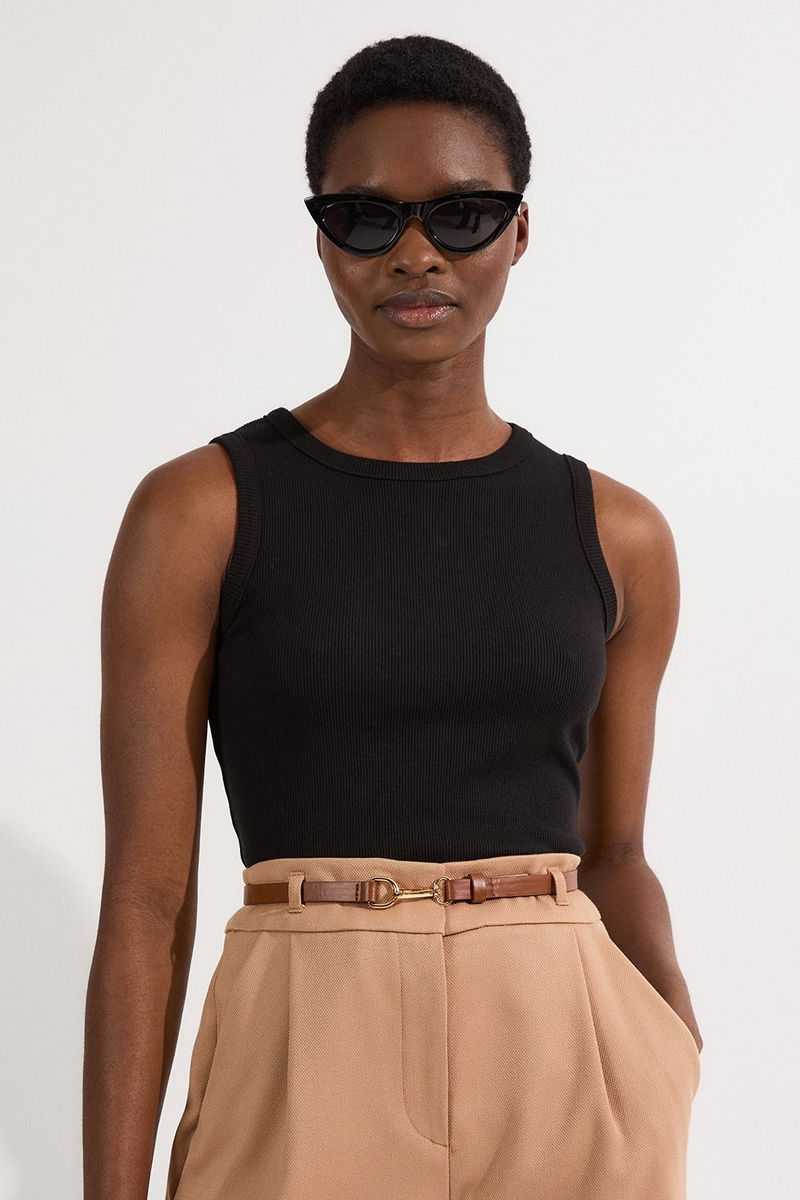 This Karen Millen Compact Jersey Ribbed Top is the quintessential wardrobe staple that works tirelessly across your casual collection. The sleeveless design and ribbed texture create a sophisticated foundation for countless daywear looks. Style with tailored shorts and a slim belt for a polished weekend ensemble, or layer under a relaxed blazer with your favourite denim for coffee dates and family gatherings. The versatile crew neckline complements statement necklaces or a silk scarf for added interest. Perfect for the summer, this top transitions seamlessly from garden parties to coastal holidays when paired with wide-leg trousers and flat sandals. Add oversized sunglasses and a woven tote for a complete daytime look that balances comfort with Karen Millen's signature refinement.