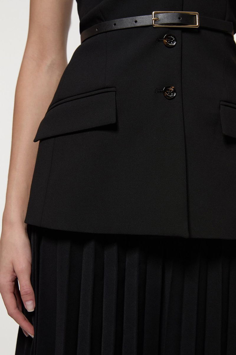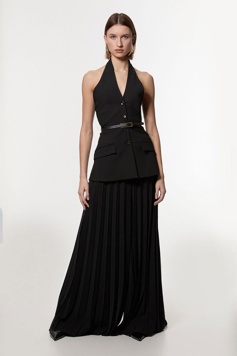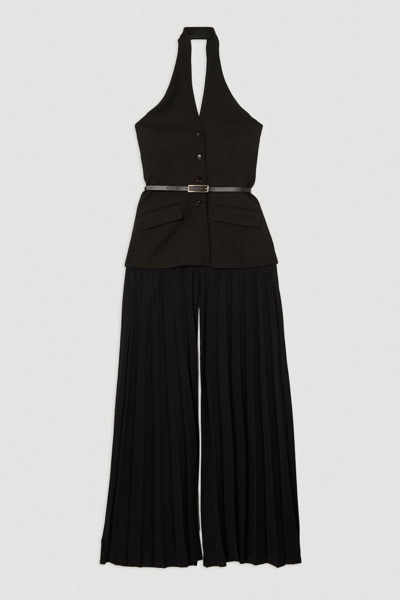 Compact Stretch Halter Neck Pleated Wide Leg Jumpsuit