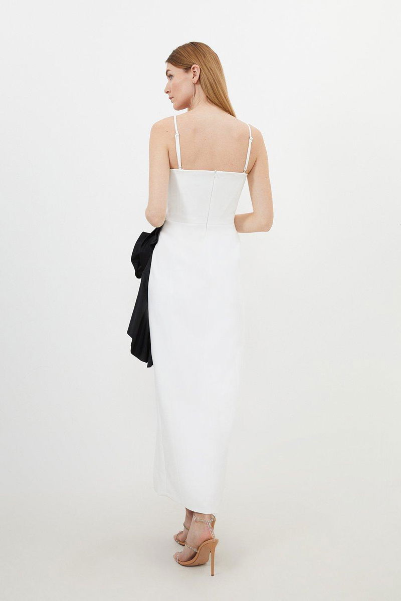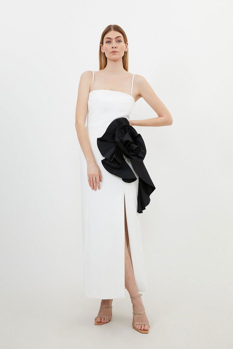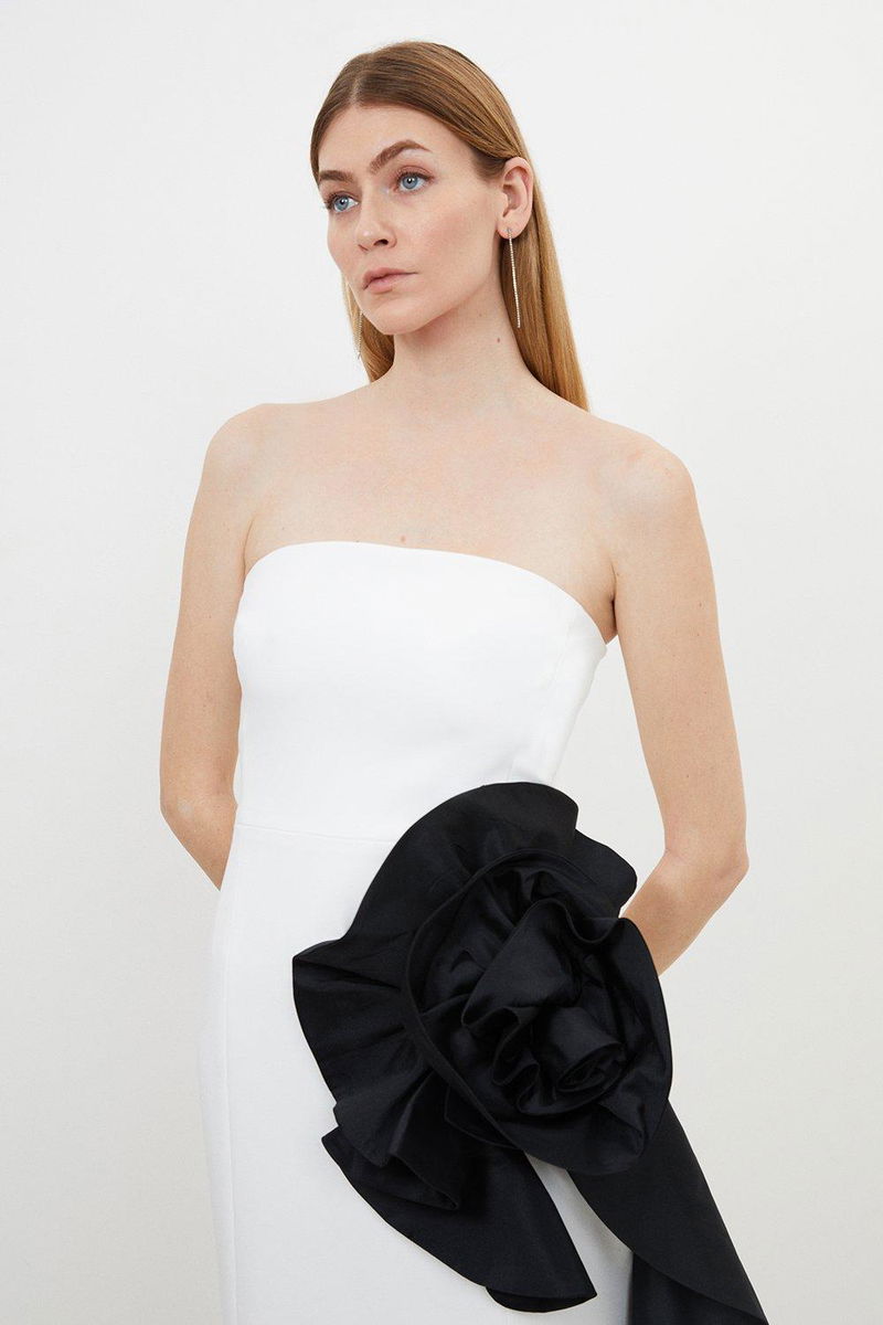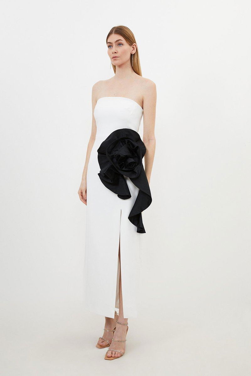 Embrace sleek and artful moments with this dress. Tailored with a structured fit from a bandeau neckline that elegantly frames the shoulders to a sophisticated midi length. Featuring a taffeta rose detail that sits at the waist for dramatic effect. Pair with barely-there stilettos for elegant occasionwear.