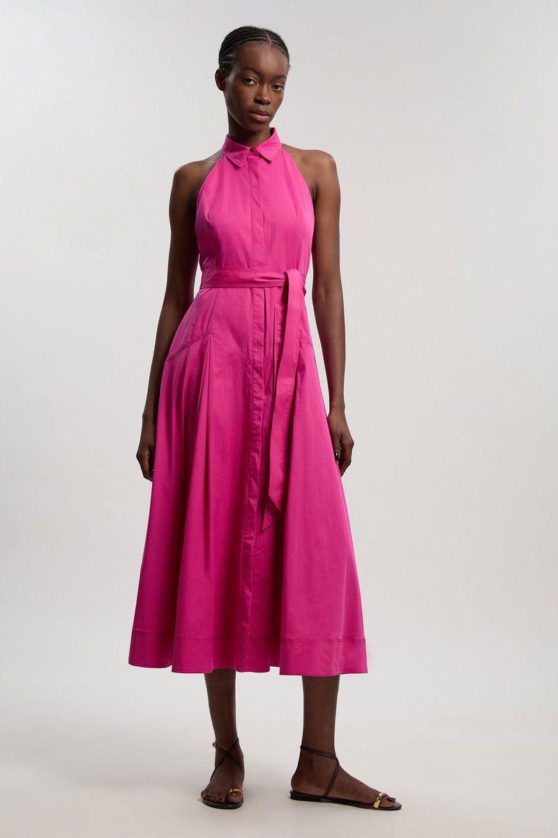 Cotton Collared Halter Neck Woven Midi Shirt Dress With Dropped Waist Detail