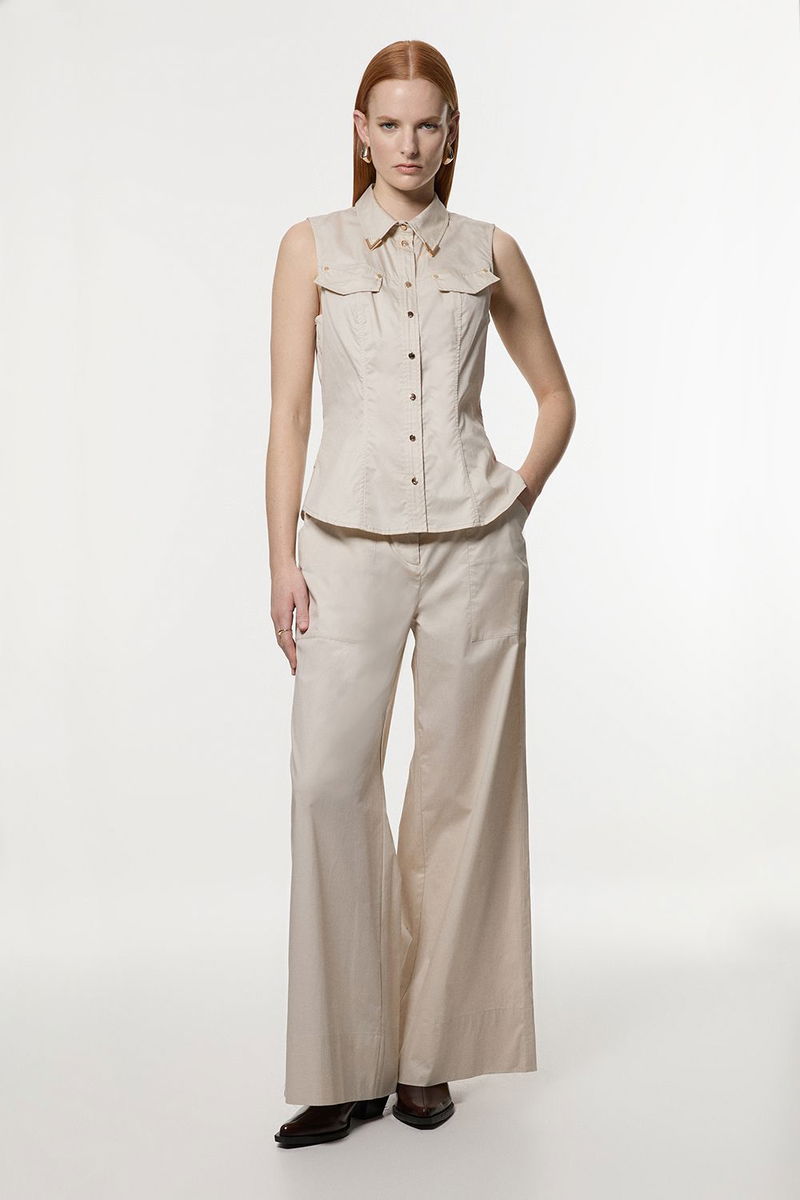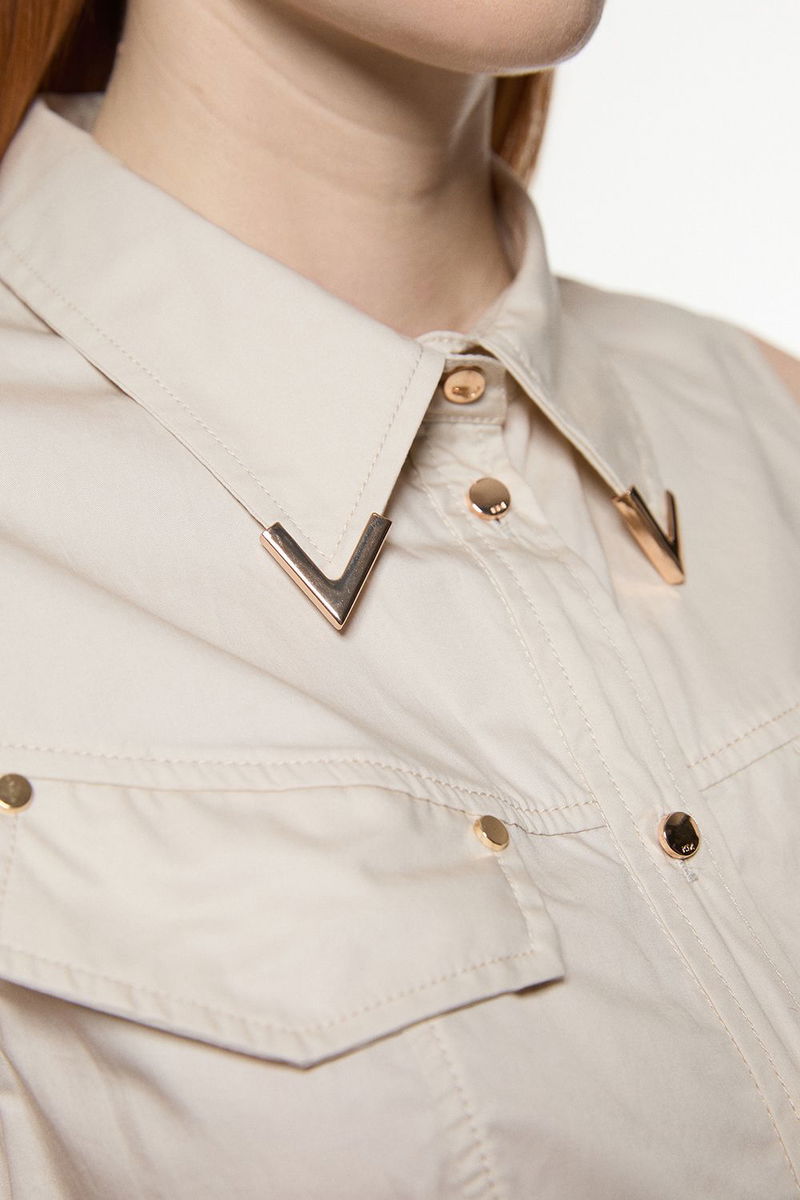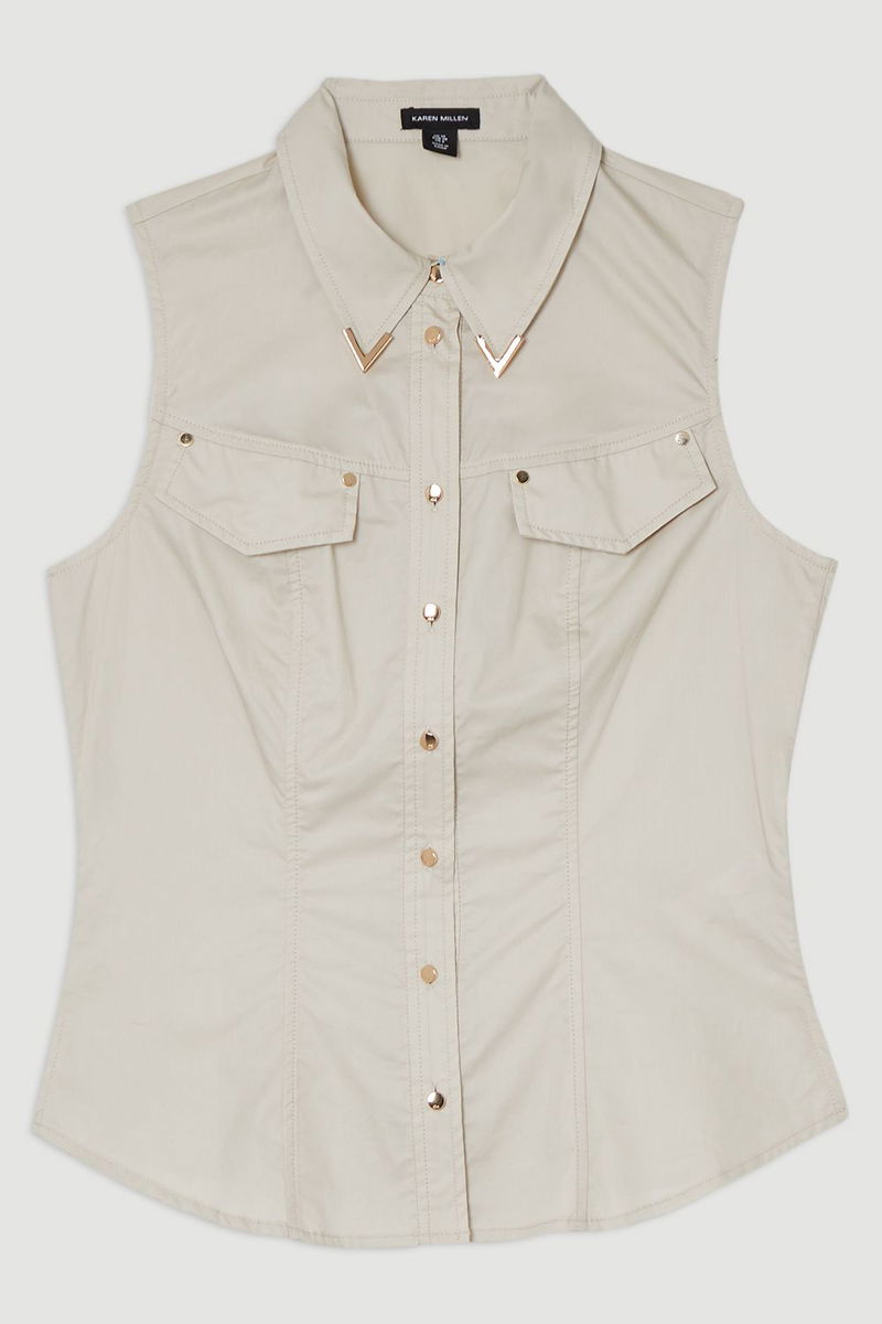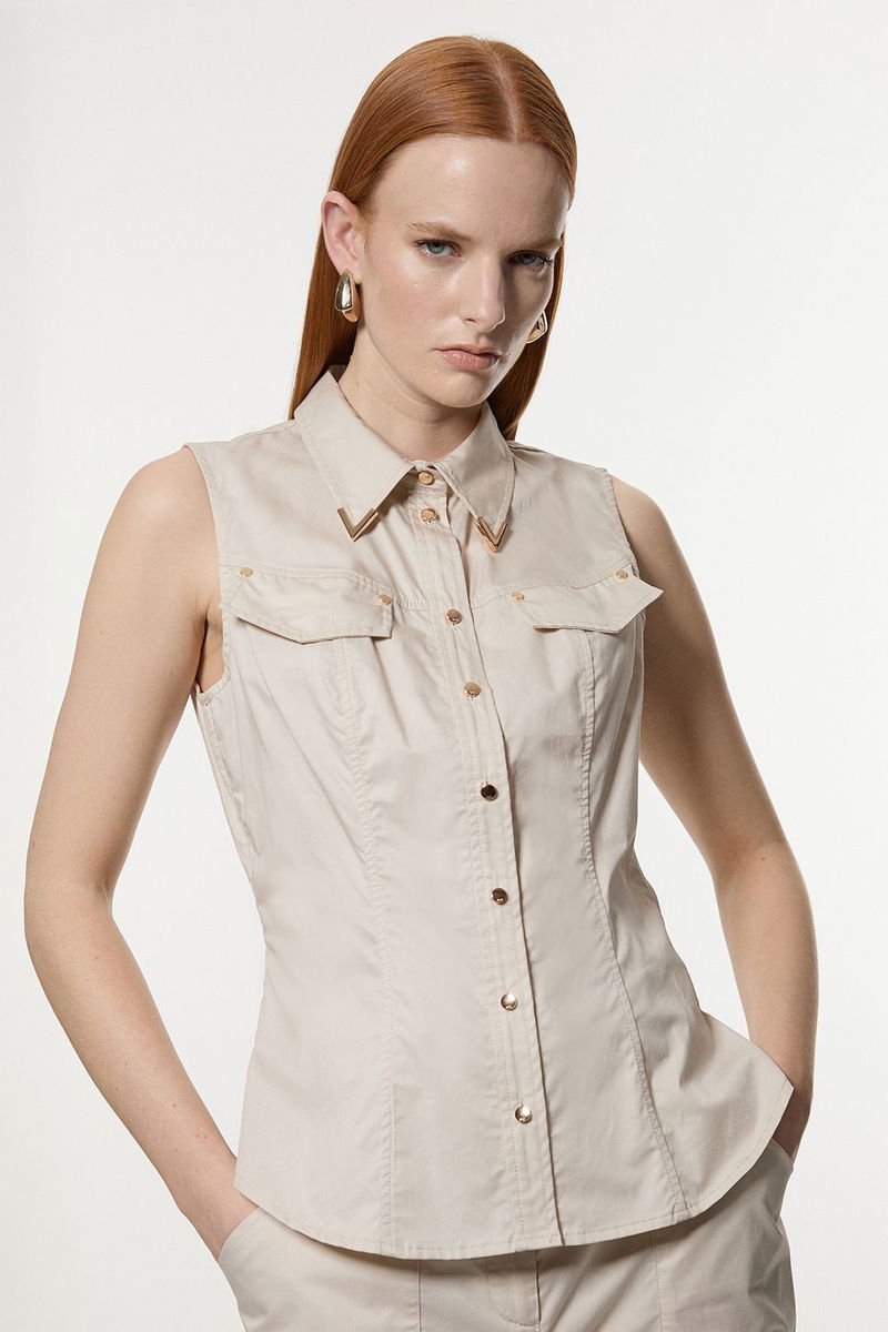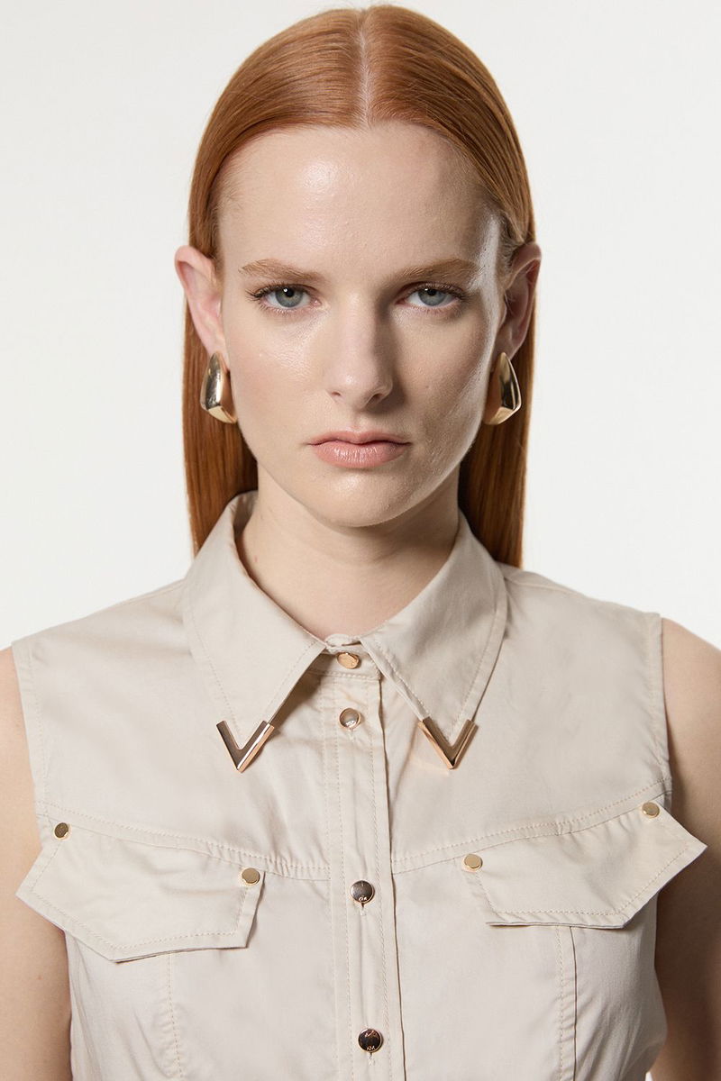 Cotton Sateen Utility Detail Woven Blouse With Gold Hardware