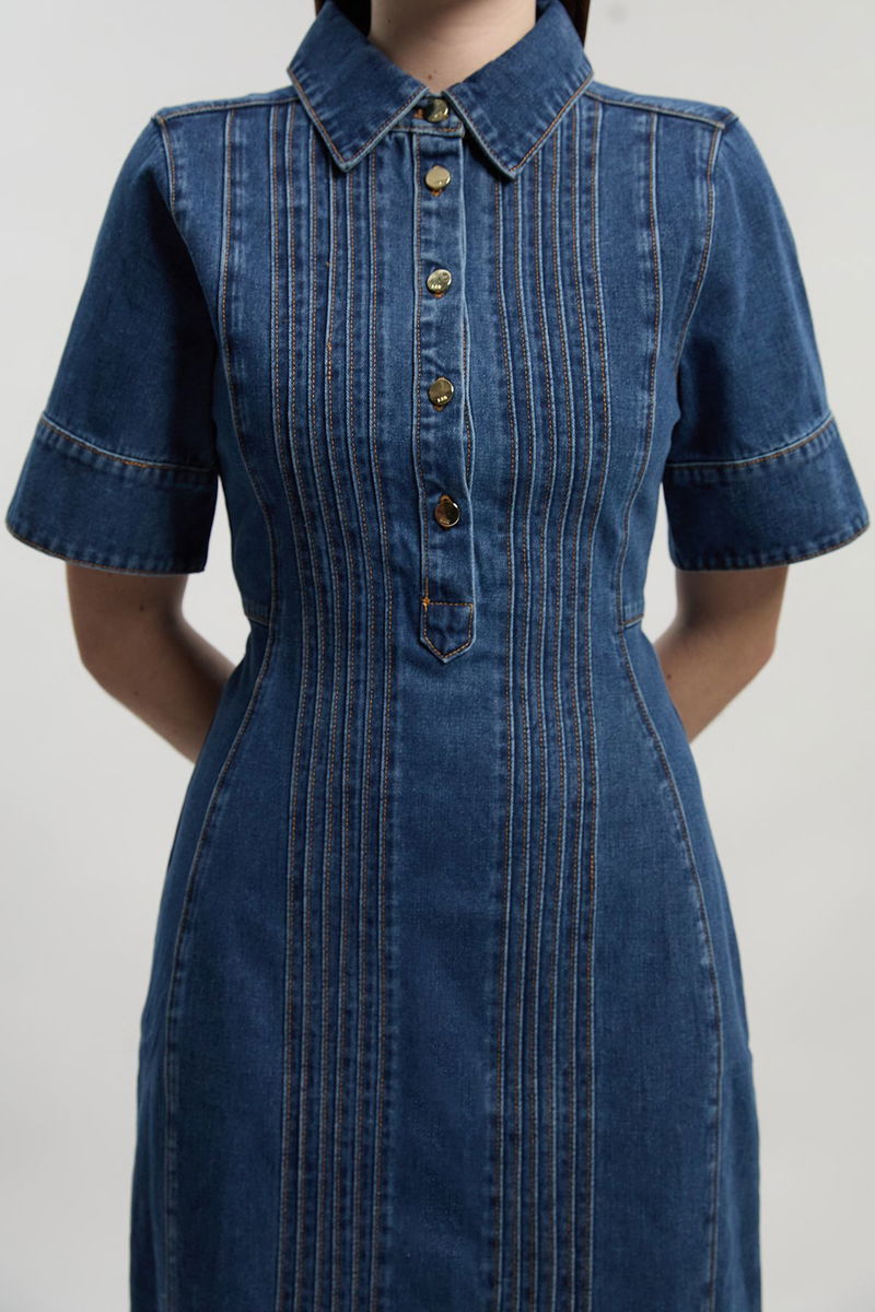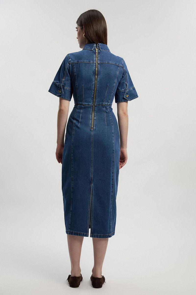 Denim Corset Stitch Detail Pencil Midi Dress