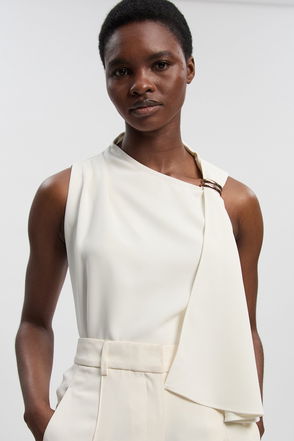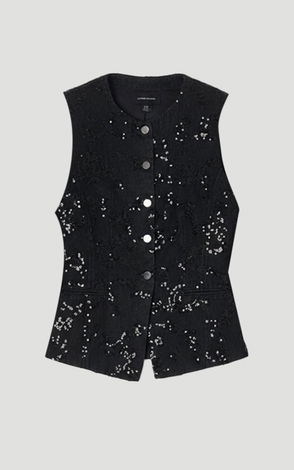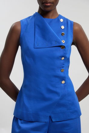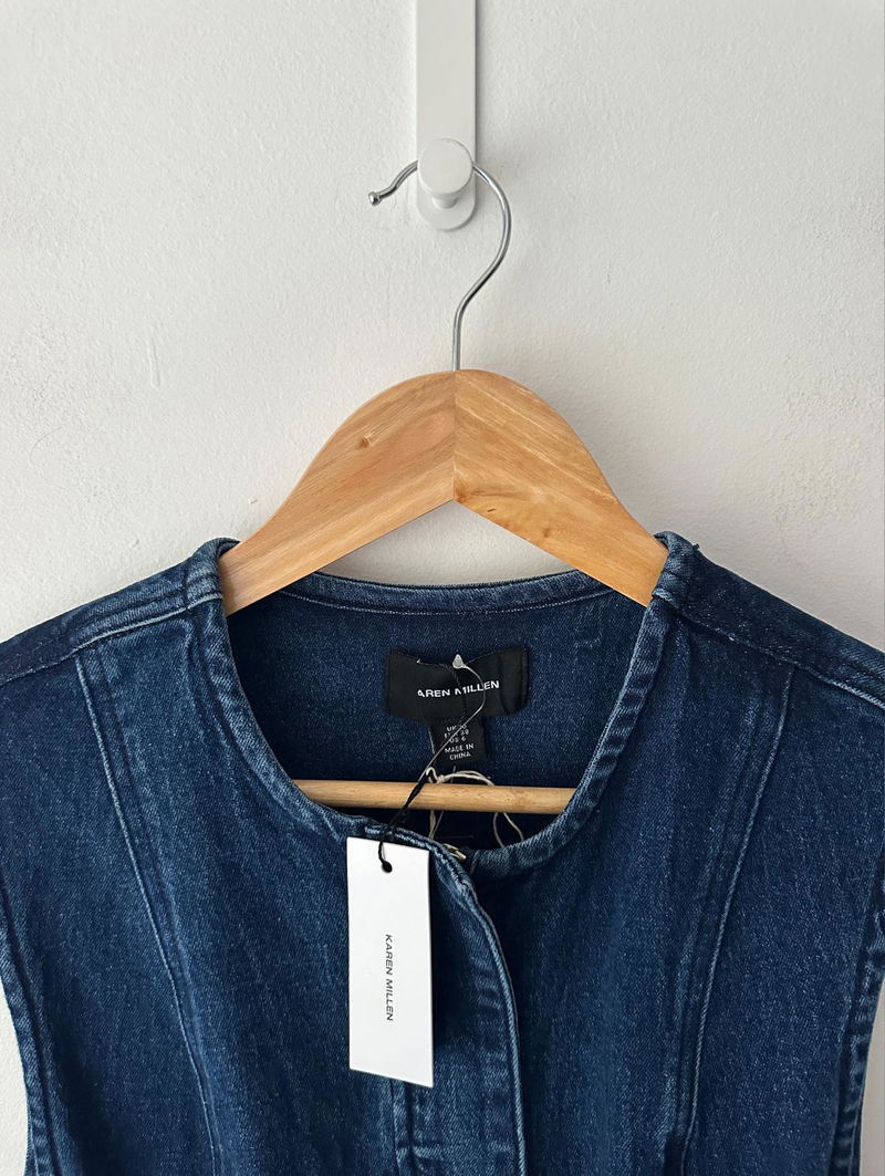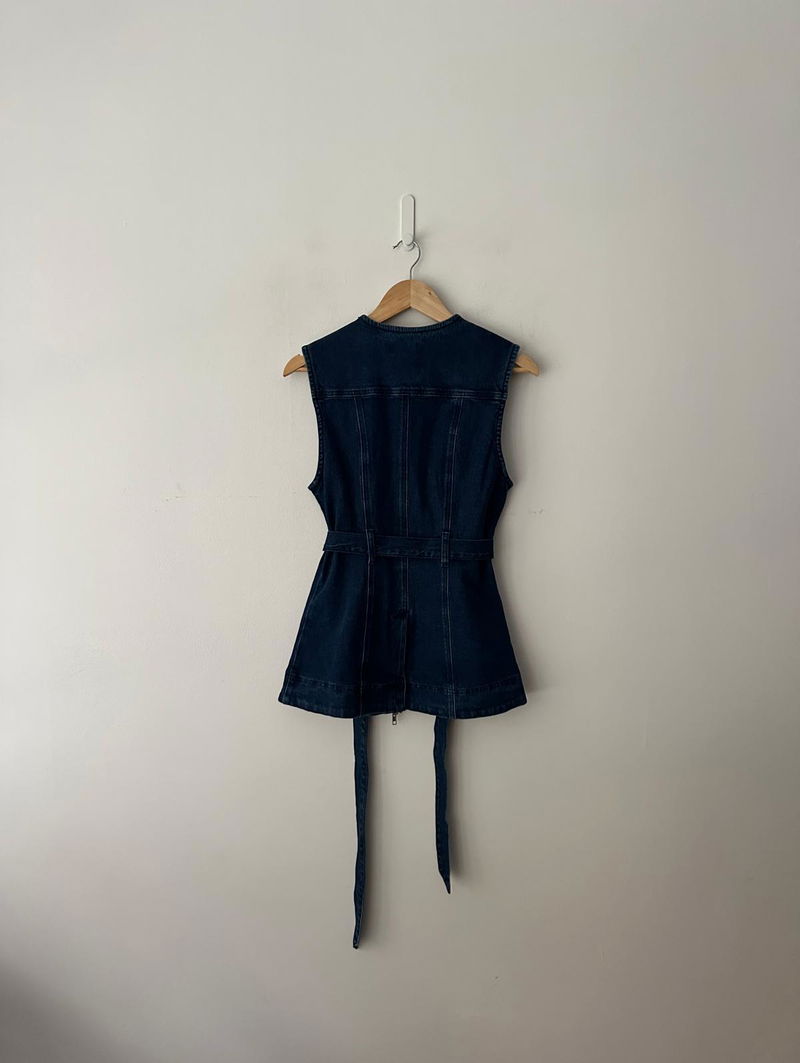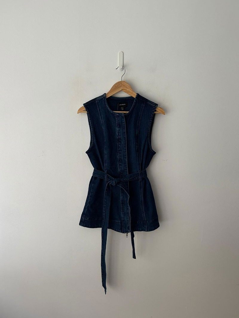 This sleeveless belted jacket redefines casual sophistication with its structured denim design. The clean lines and belted waist create a flattering silhouette that works for daytime engagements.