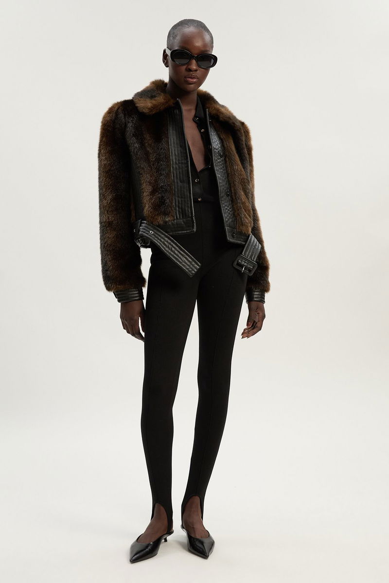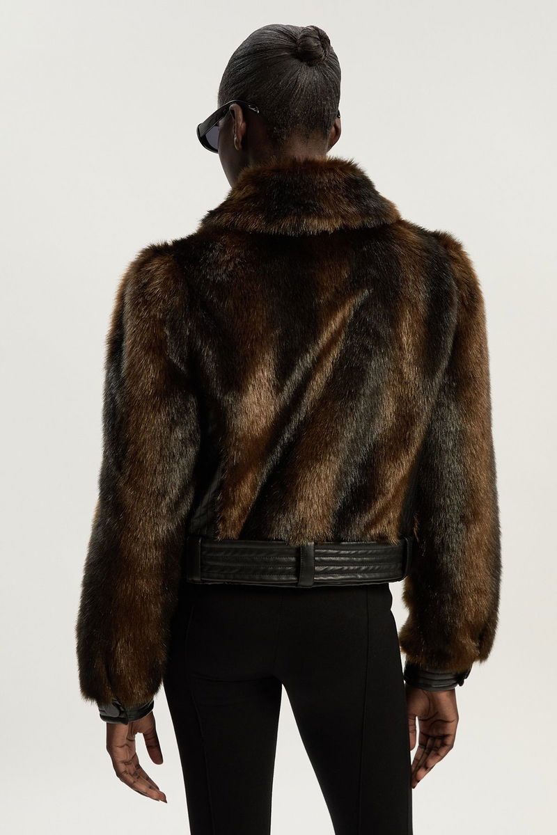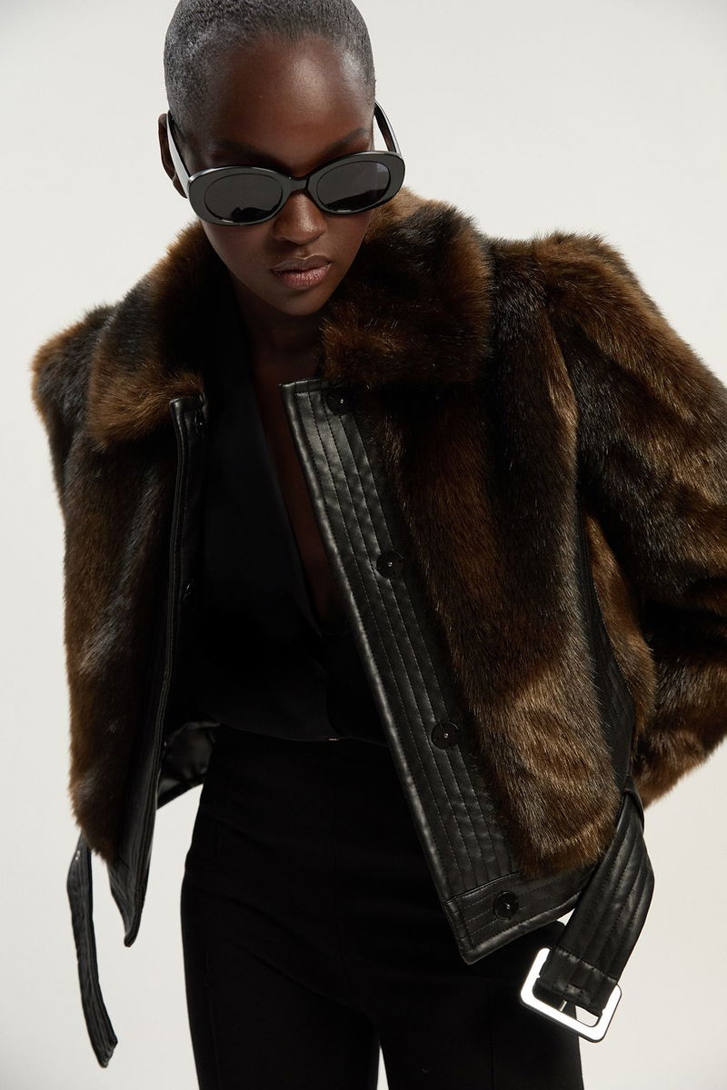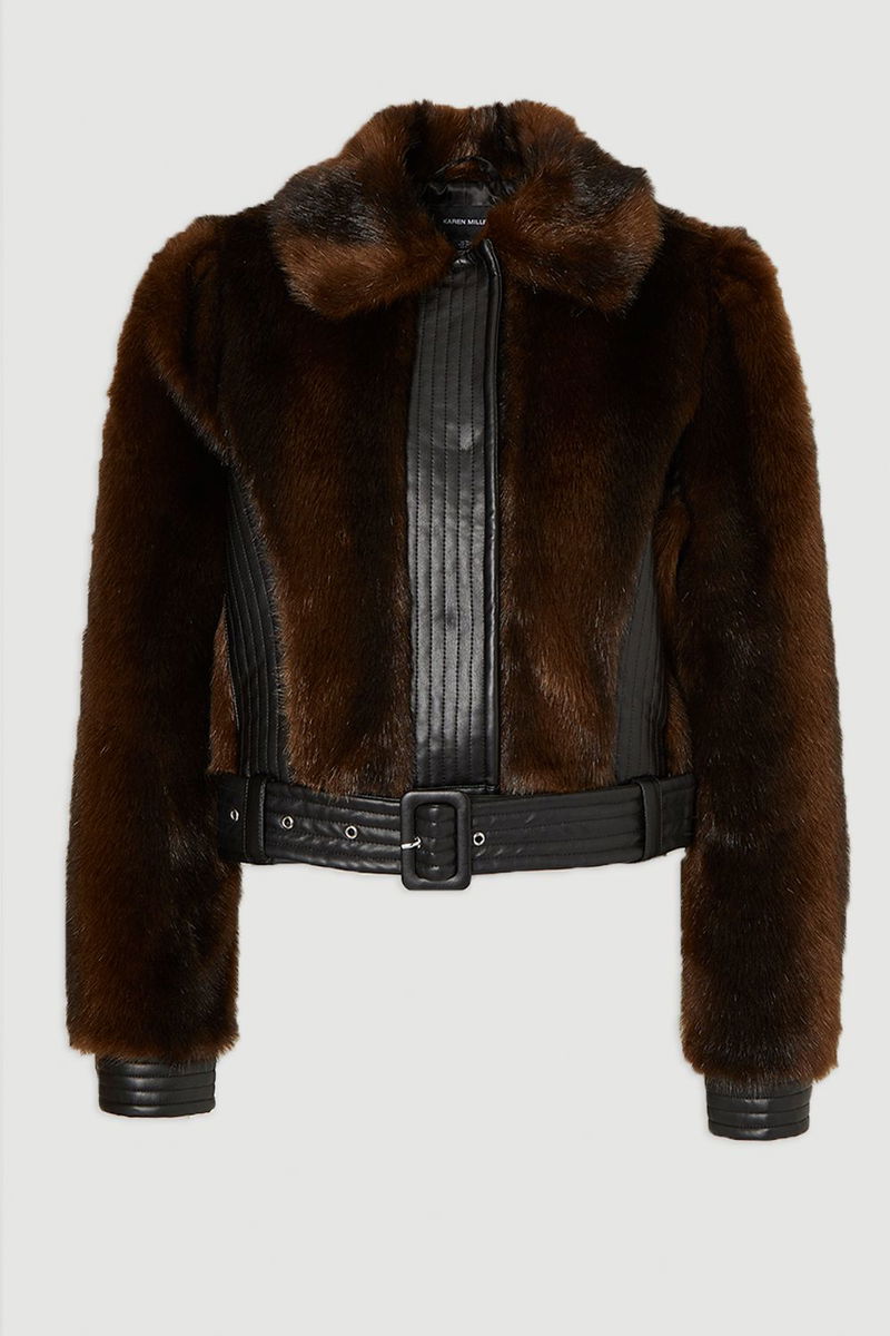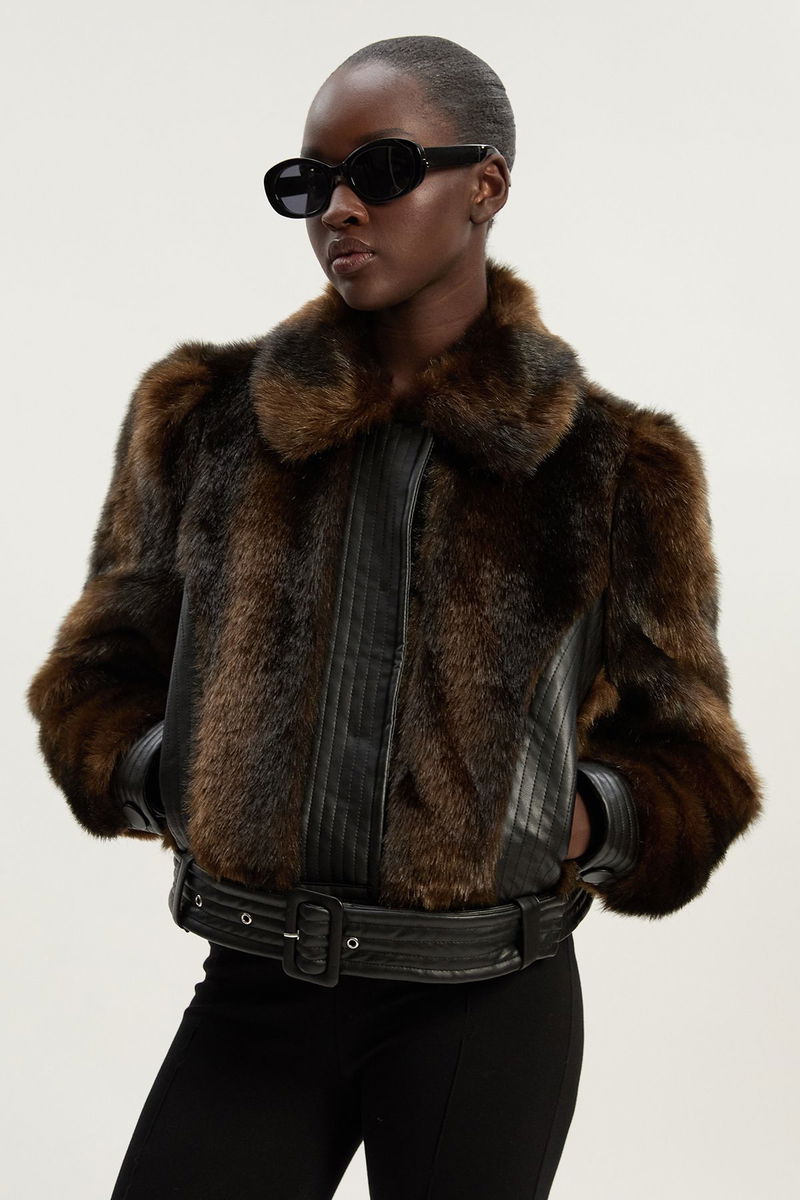 Faux Fur PU Panelled Belted Cropped Jacket