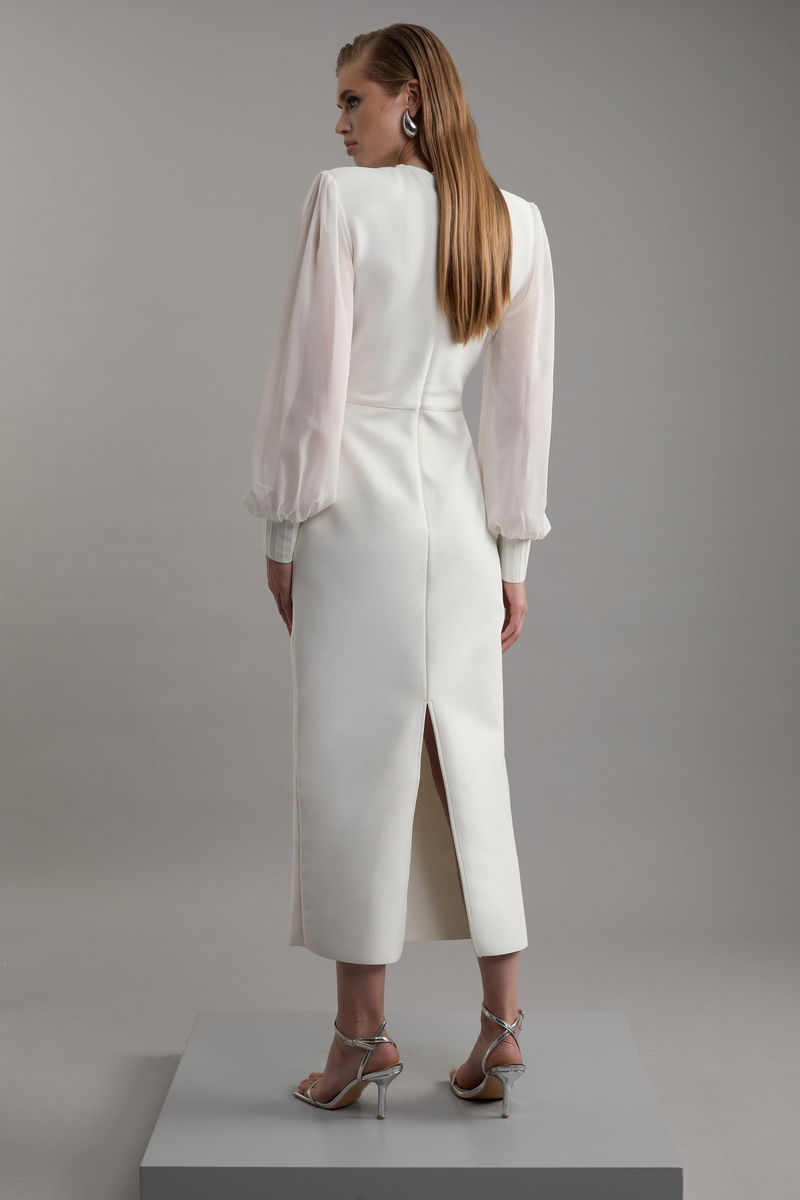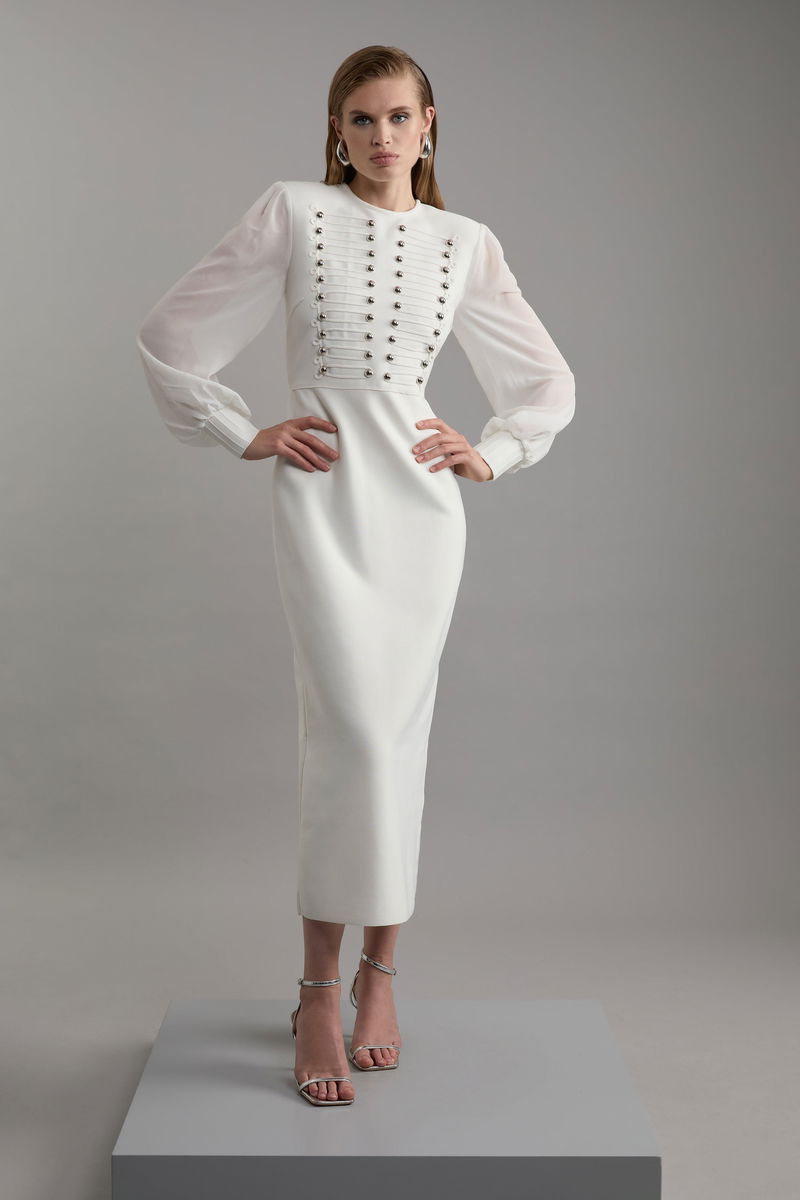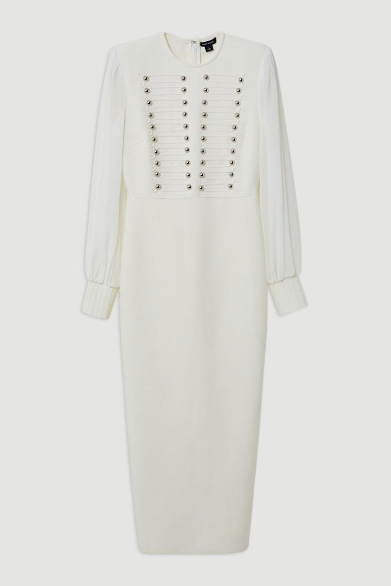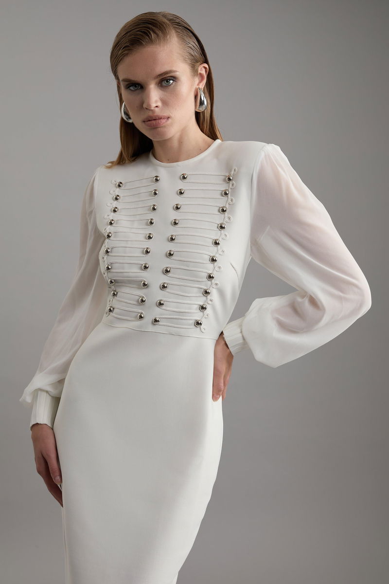 Figure Form Bandage Knit Chiffon Sleeve Military Trim Maxi Dress