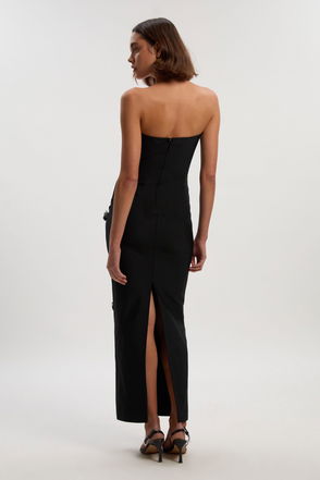 Figure Form Bandage Knit Silk Ruffle Shoulder Detail Maxi Dress