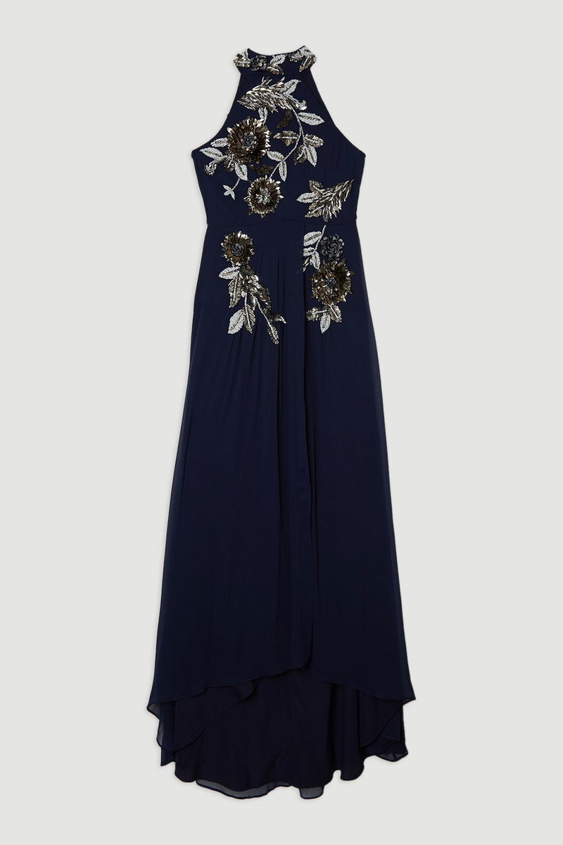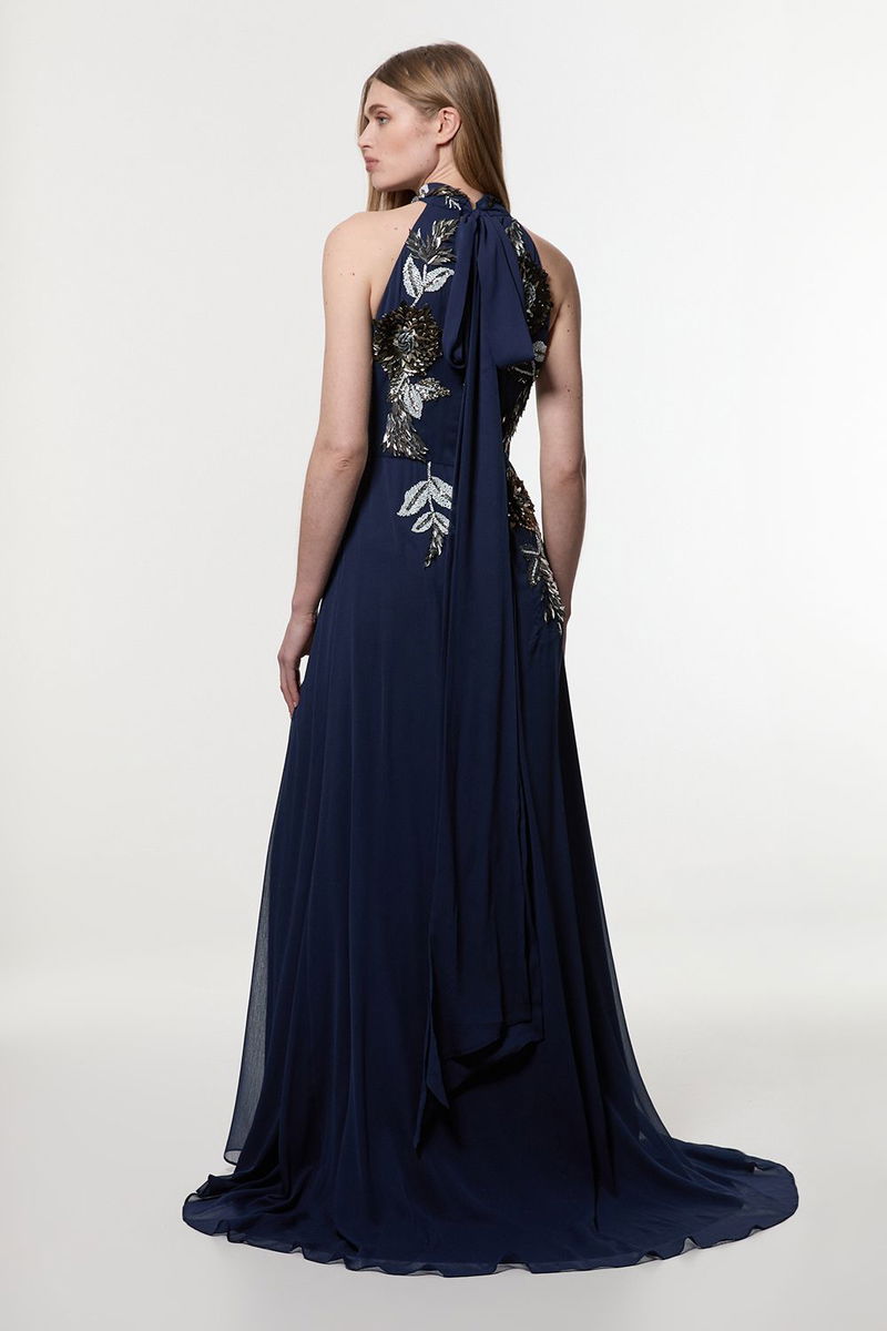 Floral 3D Embellished Halter Tie Neck Woven Maxi Dress