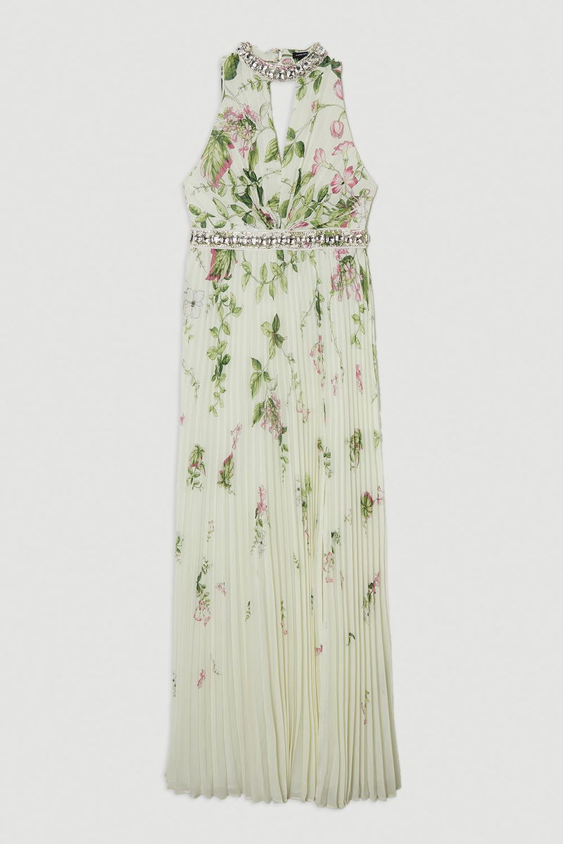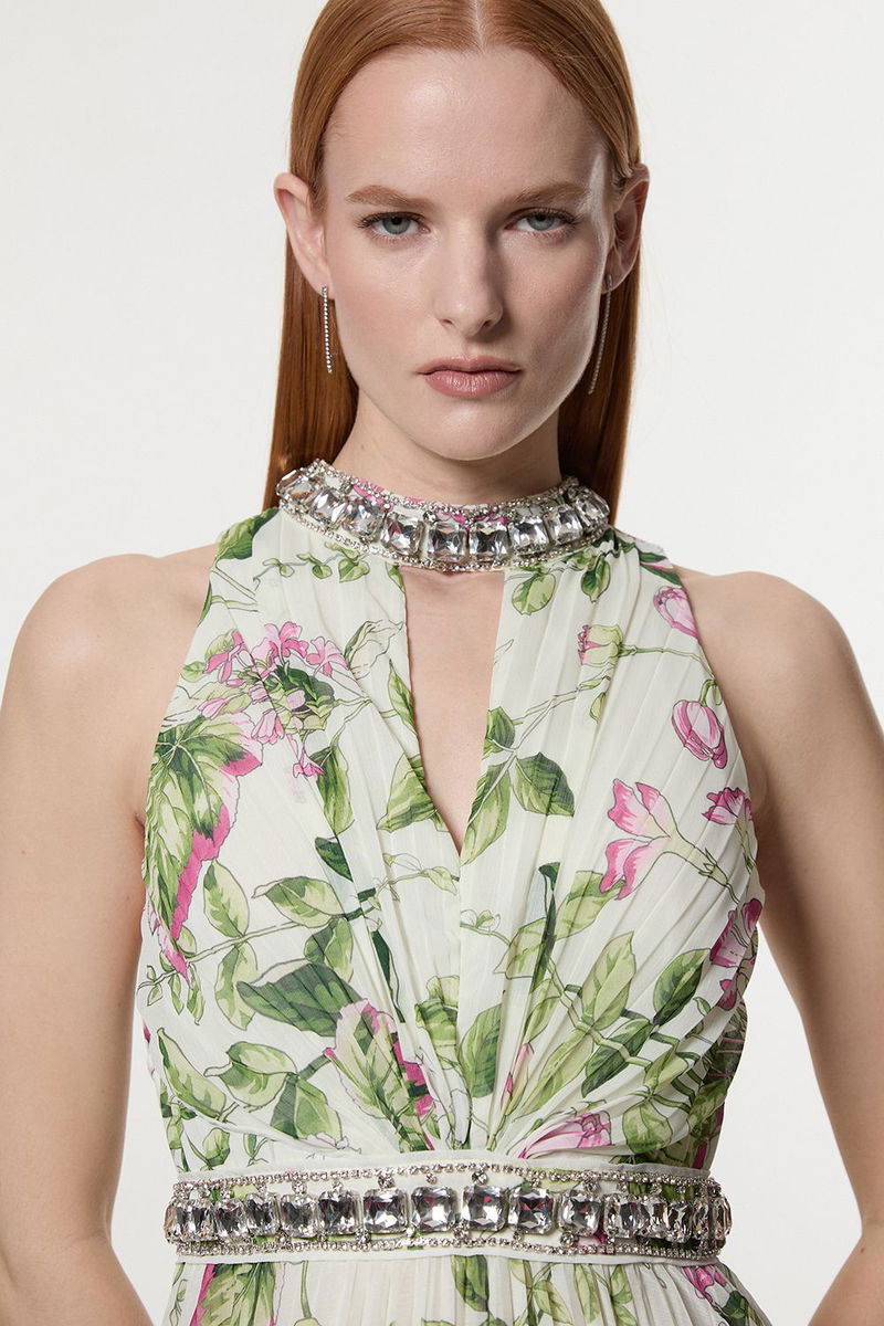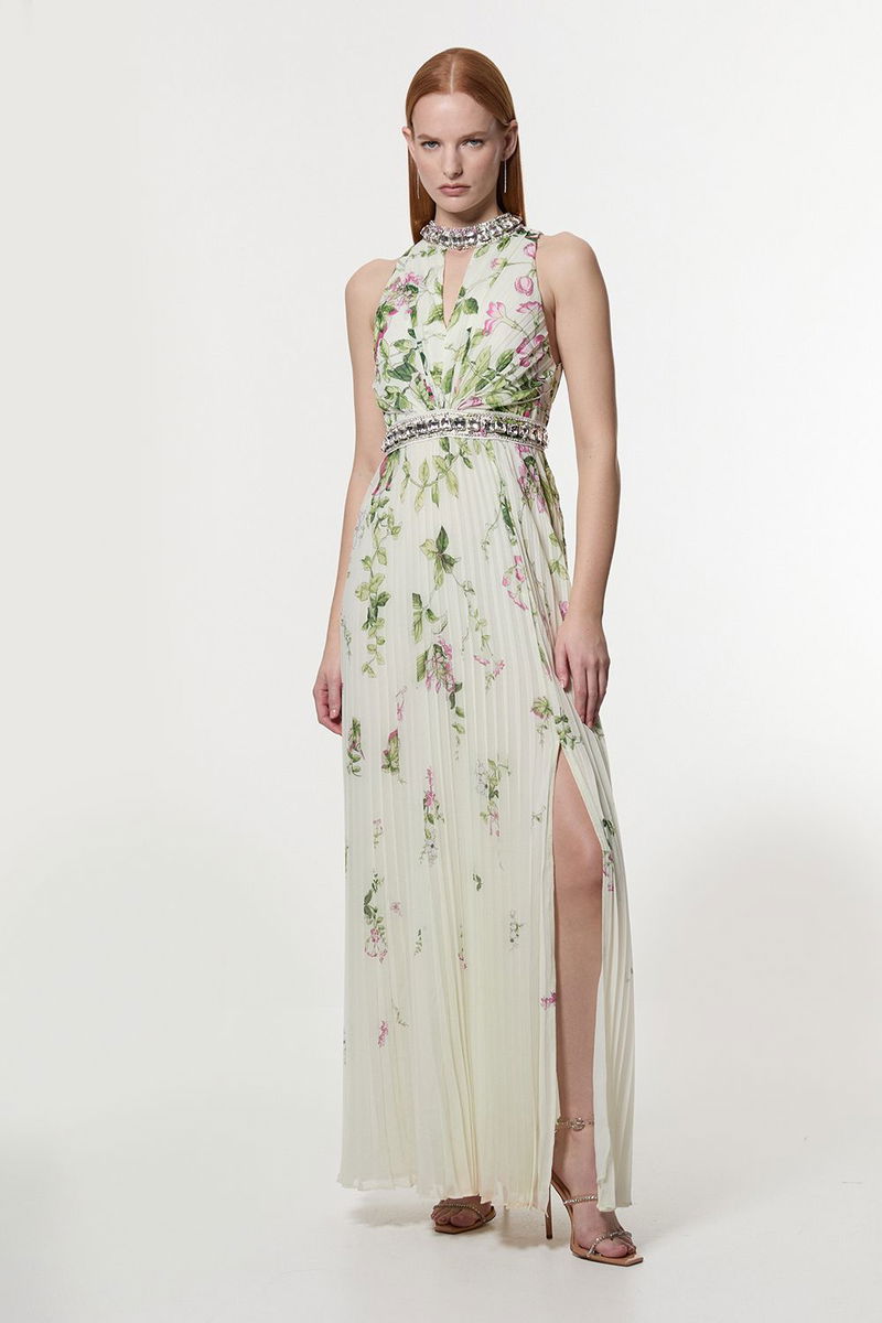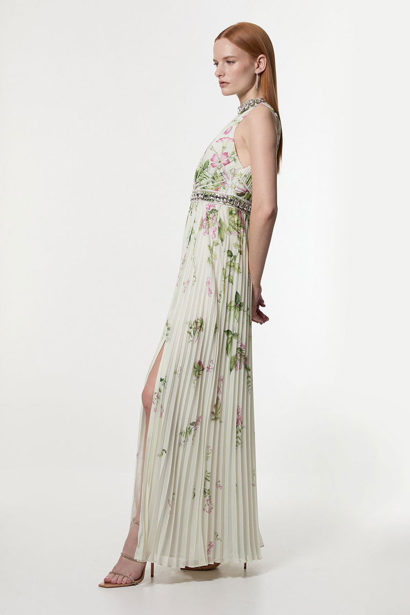 Floral Halter Diamante Enamel Trim Woven Pleated Split Maxi Dress