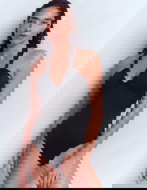 Make a statement with this Karen Millen Hardware Detail Belted Plunge Swimsuit. The dramatic plunge neckline creates a flattering silhouette, whilst the distinctive belt with its oversized buckle adds a touch of luxury and definition to your waistline. Style with oversized sunglasses and layered chain necklaces for a glamorous poolside look, or pair with a flowing maxi skirt and sandals for elegant beachside dining. Perfect for those who appreciate sophisticated beachwear with architectural details, this swimsuit transitions seamlessly from daytime sunbathing to sunset cocktails. The halter design ensures comfort without compromising on style, making it an essential addition to your holiday wardrobe for coastal getaways and resort escapes.
