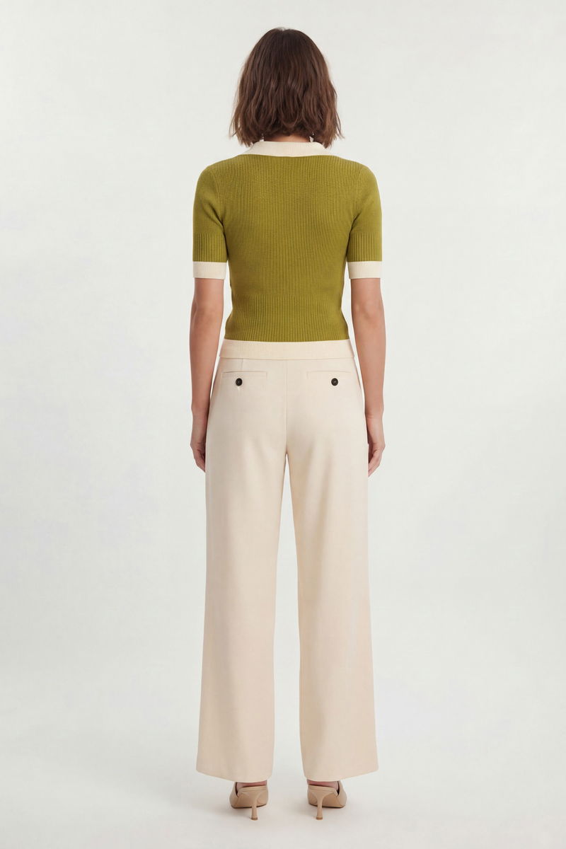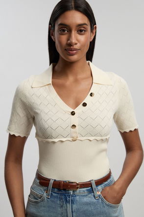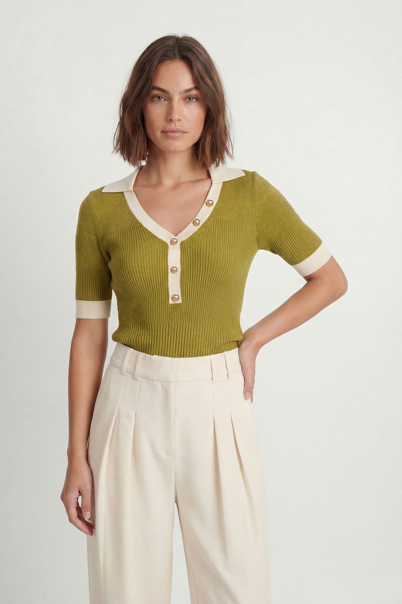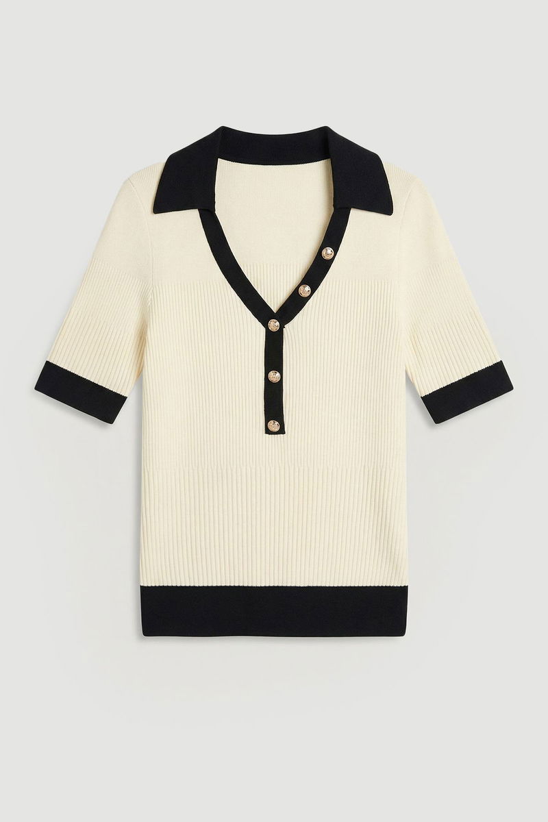 Knit Rib With Contrast Hem Detail Collared Short Sleeve Top