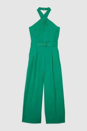 Linen cross front belted jumpsuit.