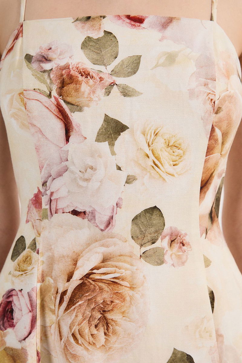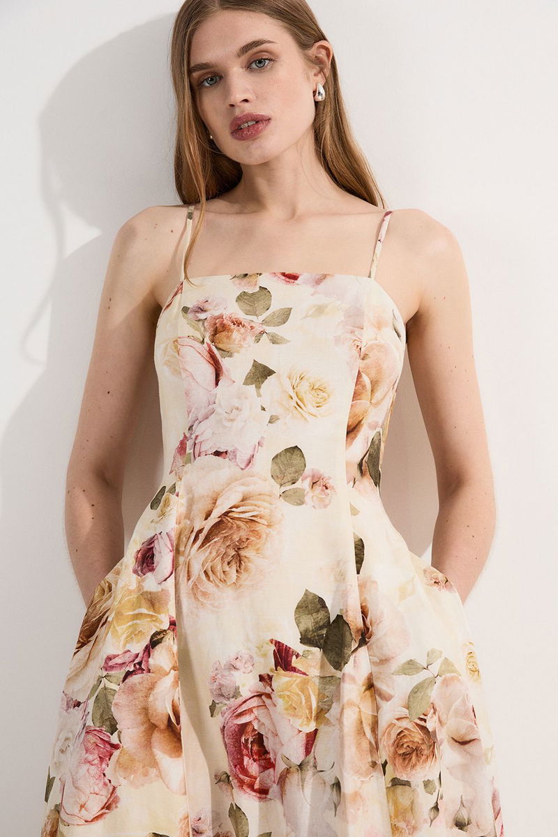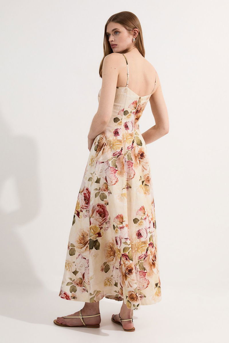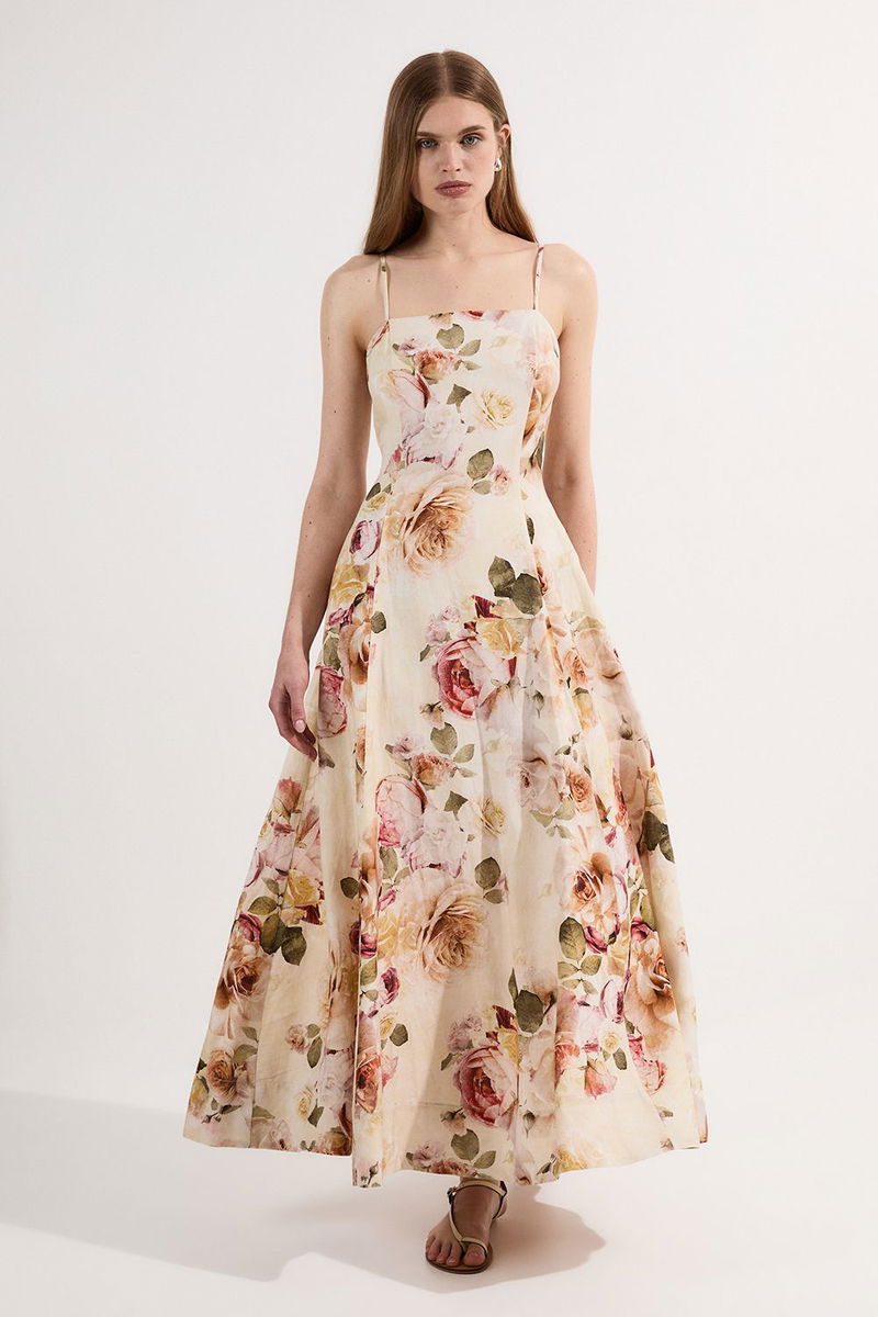 Linen Viscose Floral Printed Woven Maxi Prom Dress