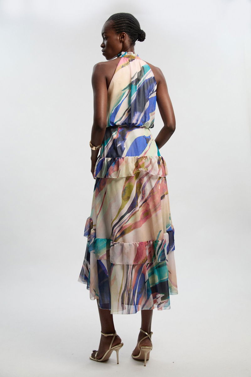 Marble Print Crinkle Chiffon Halter Neck Woven Maxi Dress