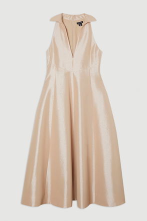 Metallic Taffeta One Shoulder Ruffle Full Skirt Tailored Maxi Dress