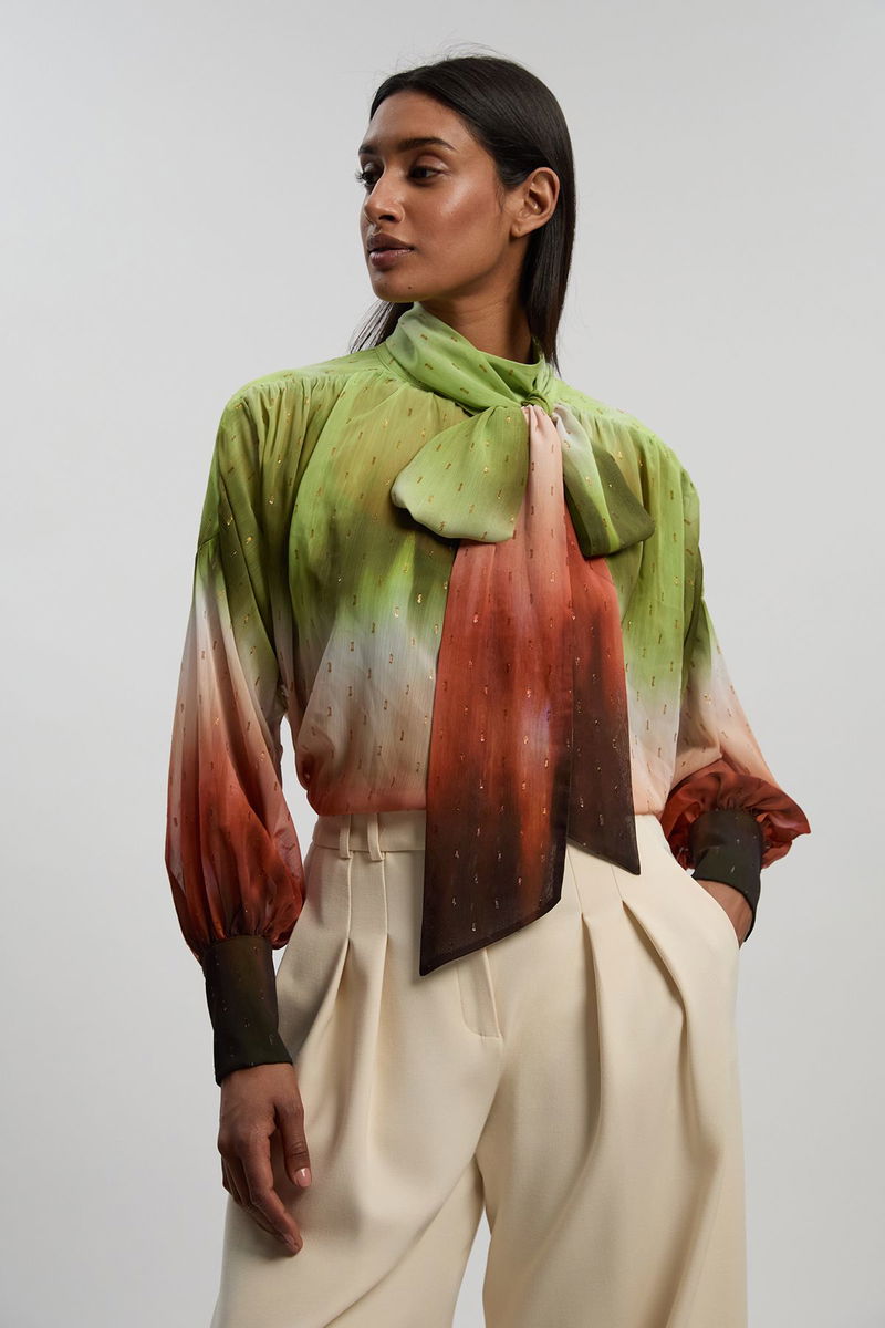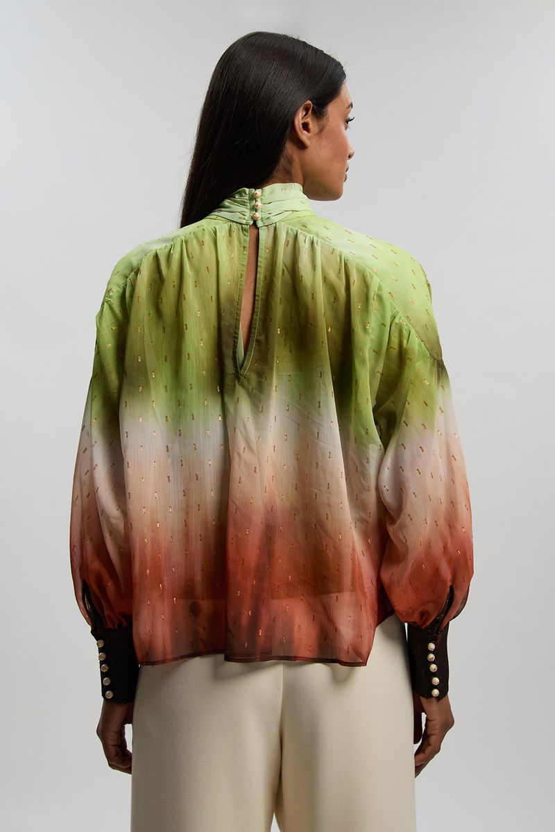 Metallic Thread Ombre Print Woven Balloon Sleeve Blouse
