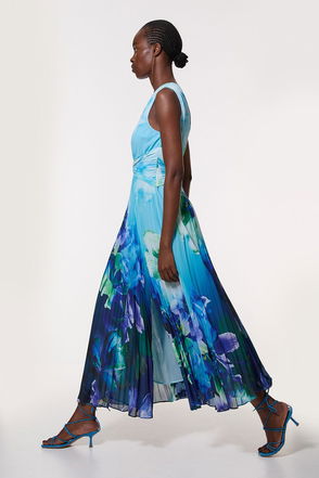 Prepare to turn heads in this maxi dress, designed to make a statement. It features a high neckline and a universally flattering fit and flare silhouette, while lined details offer a structural element. Complete with a full skirt at a maxi length, this style cinches in at the waist, balancing the figure and making it easy to style.