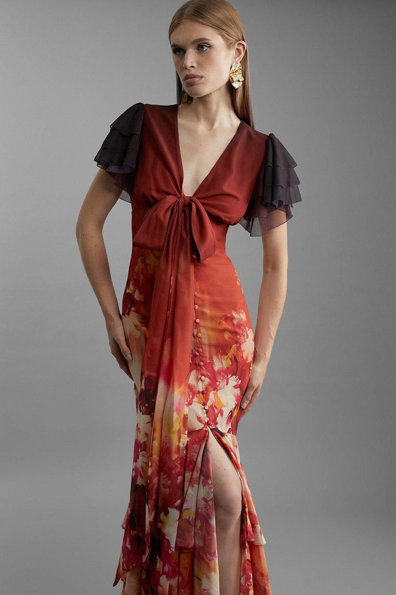 Ombre Floral Ruffle Sleeve Button Through Maxi Dress