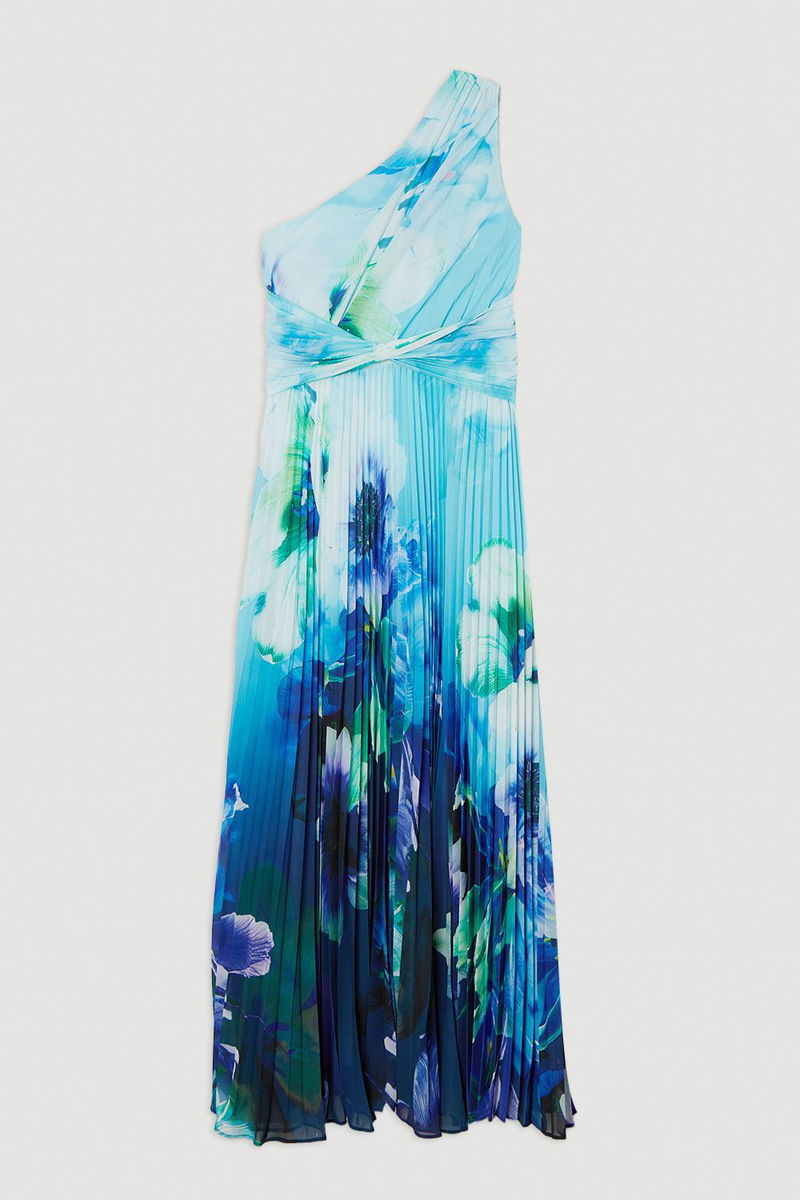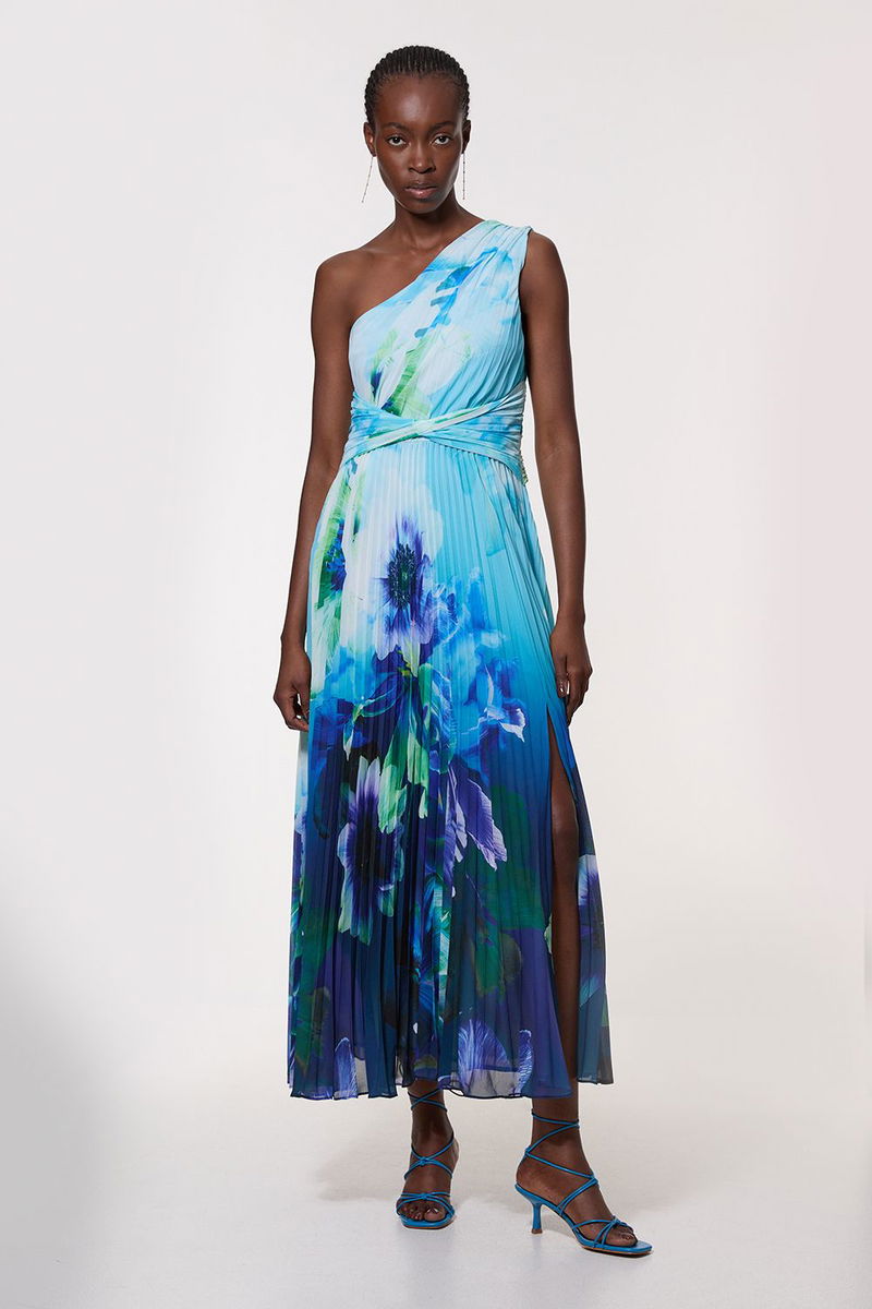 Ombre Floral Soft Pleated One Shoulder Maxi Dress