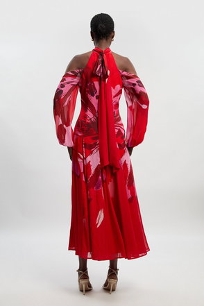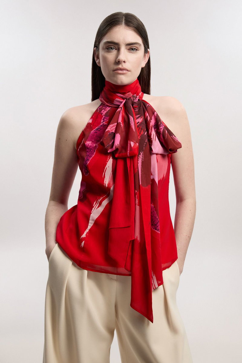 This captivating sleeveless top showcases a striking photographic floral print that commands attention. The distinctive tie neck creates a refined focal point, whilst the crinkle georgette fabric drapes beautifully to flatter your silhouette. Designed specifically for petite proportions, this Karen Millen piece pairs wonderfully with tailored trousers as shown, creating a balanced silhouette perfect for sophisticated occasions. The sleeveless cut makes it ideal for summer events, from garden parties to formal gatherings, whilst also transitioning seamlessly to cooler months when layered beneath a structured blazer. For evening affairs, style with a slim-fit pencil skirt and pointed court shoes to enhance its elegant appeal. This versatile top embodies contemporary refinement with its artistic print and considered design details.