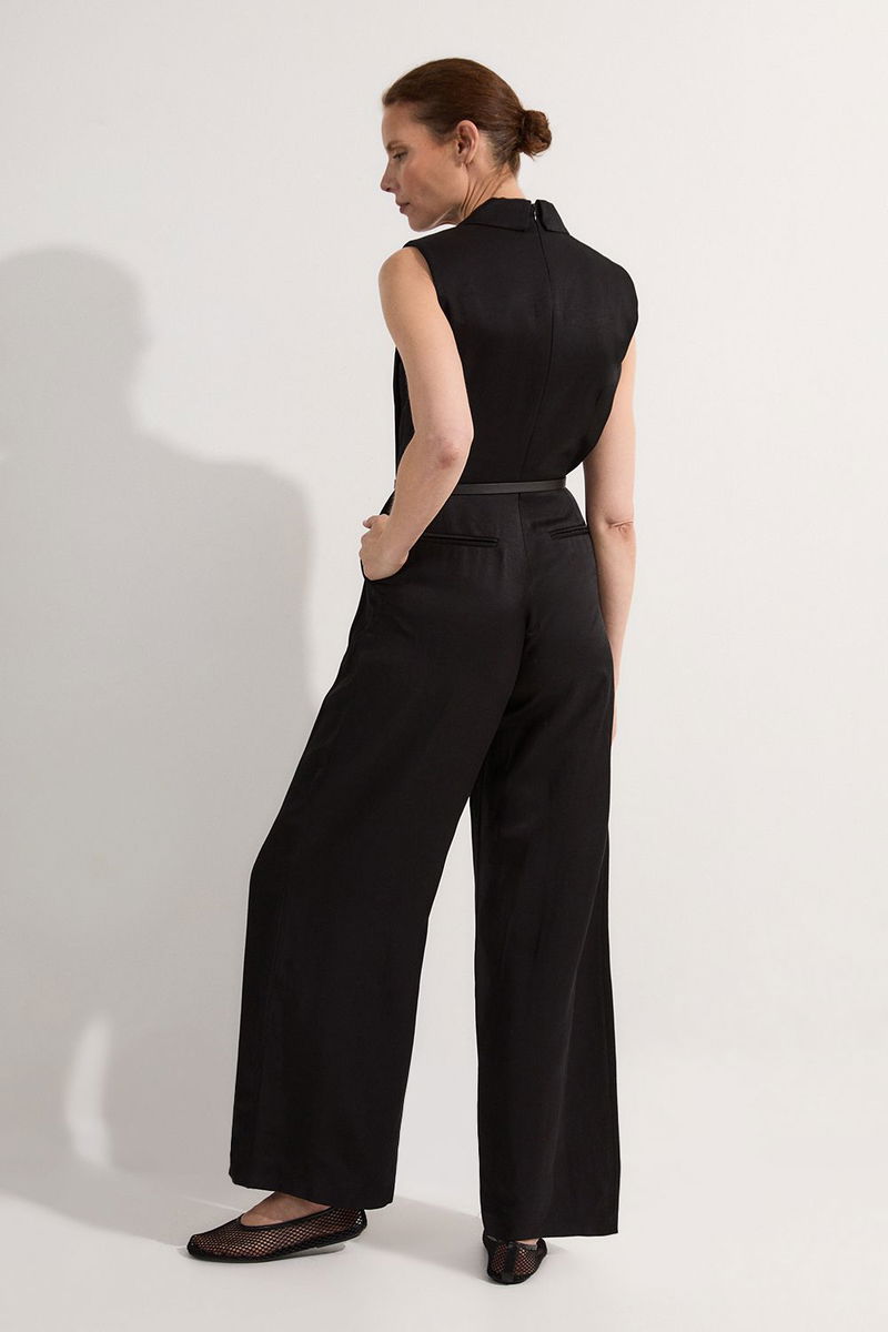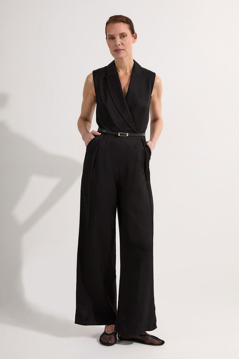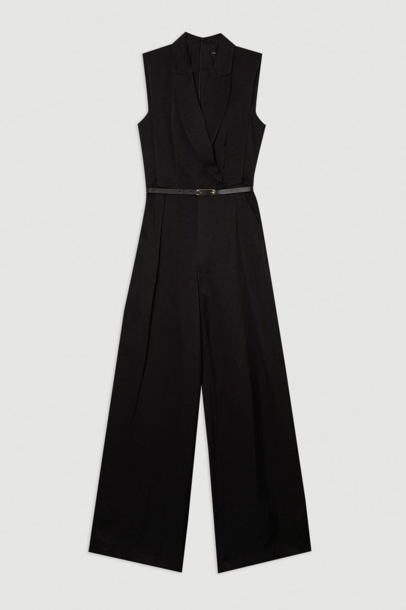Petite Premium Viscose Linen Tailored Belted Wide Leg Jumpsuit