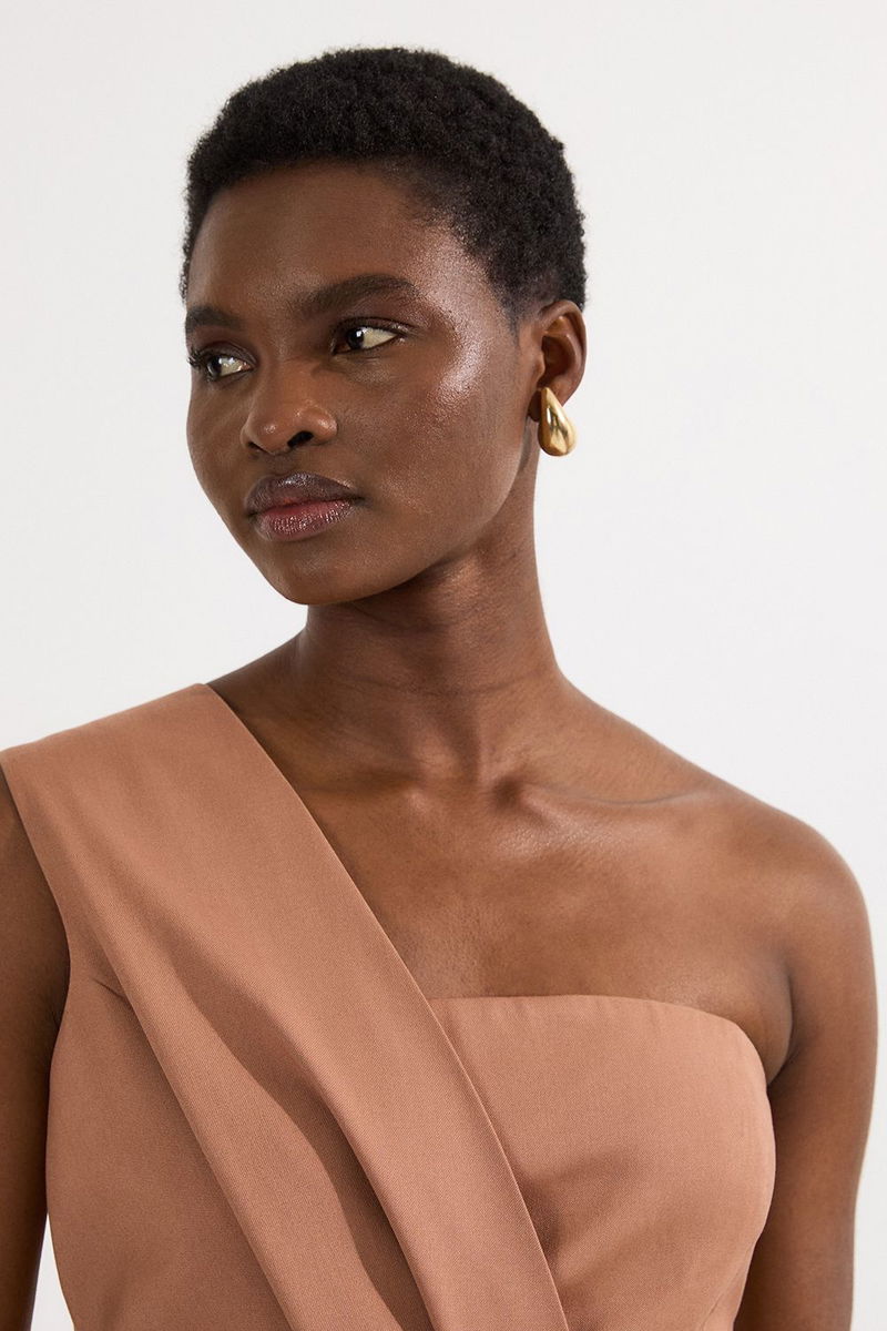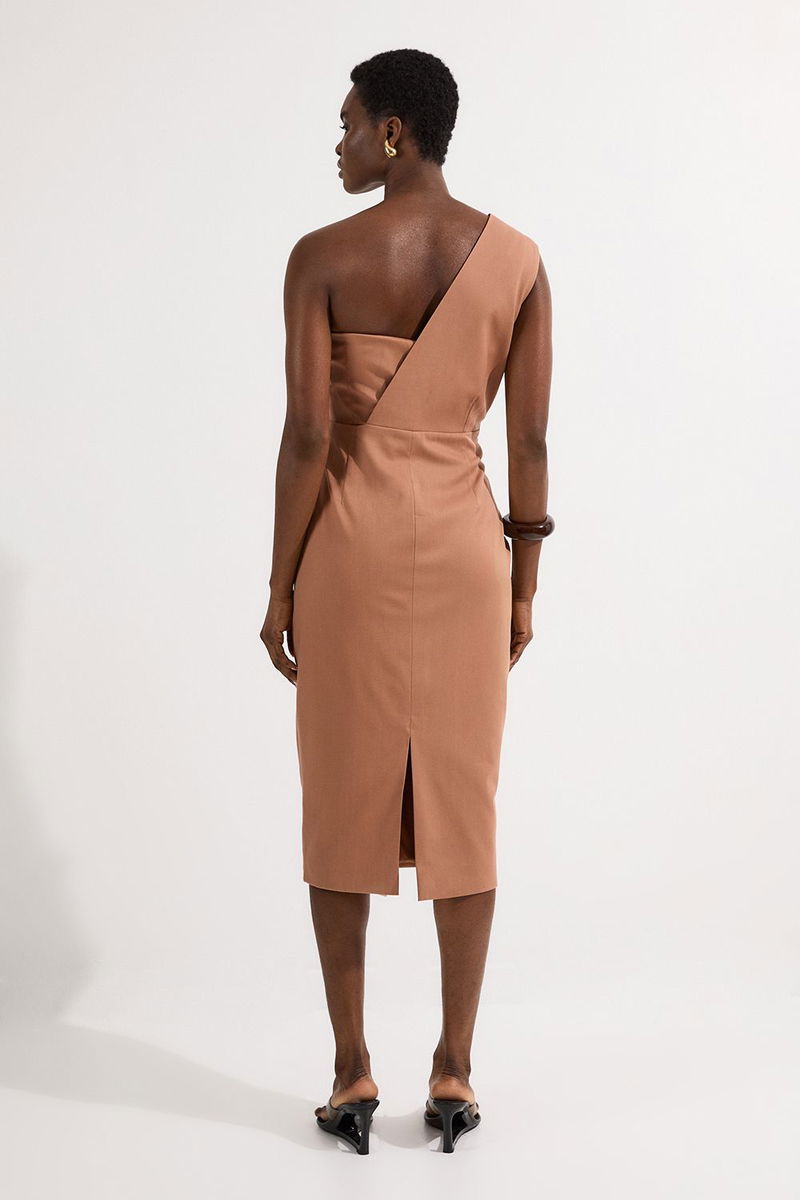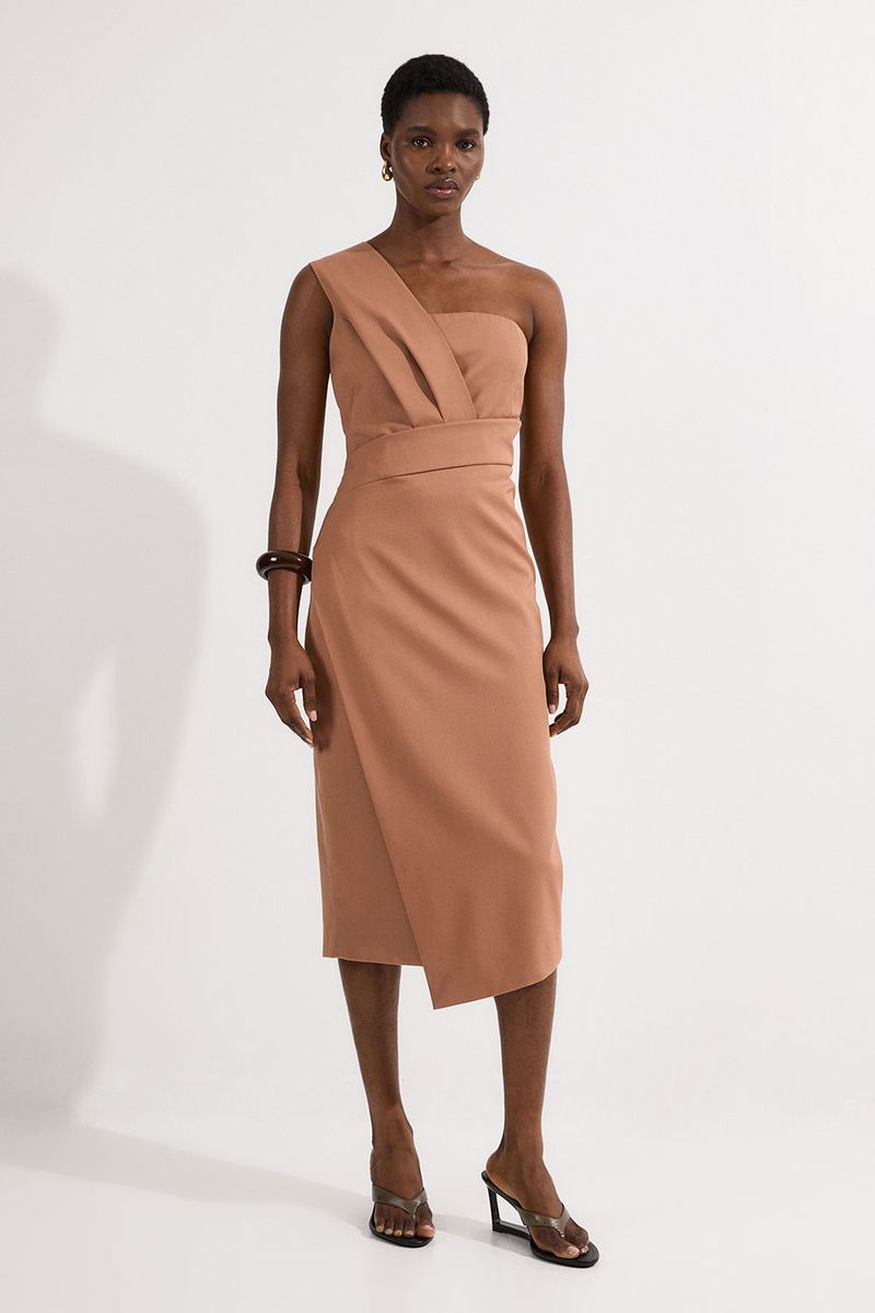 Petite Tailored One Shoulder Tuck Detail Pencil Midi Dress
