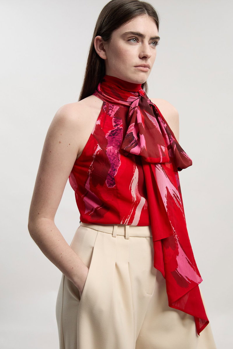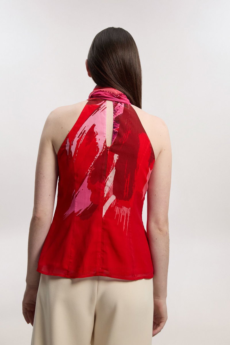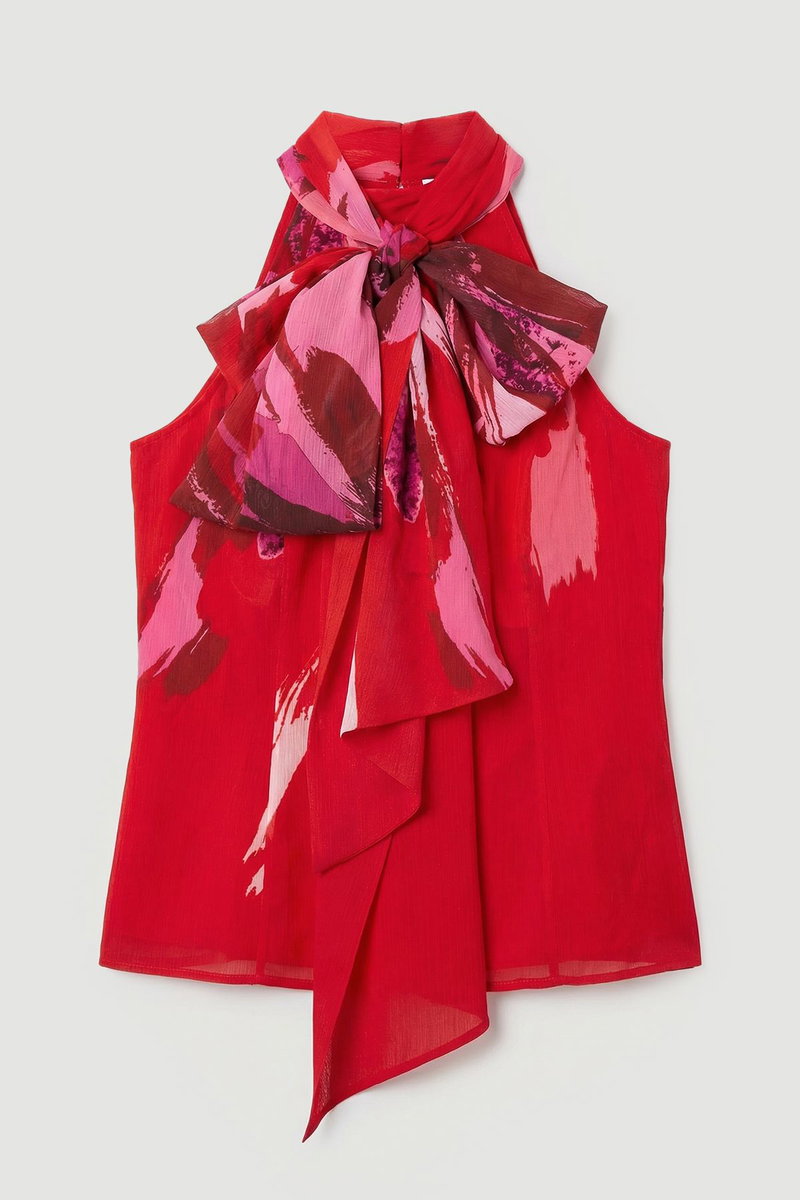 Photographic Floral Crinkle Georgette Sleeveless Tie Neck Woven Top