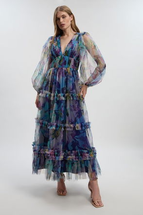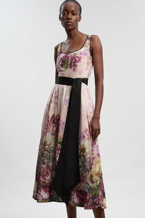 Photographic Floral Heavy Satin Drop Waist Maxi Dress