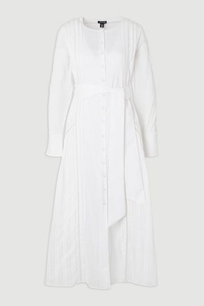 Pleated Detail Cotton Long Sleeve Woven Midi Dress