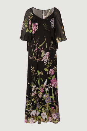 Plus Size Baroque Embroidered Cape Sleeve Twill Woven Maxi Dress