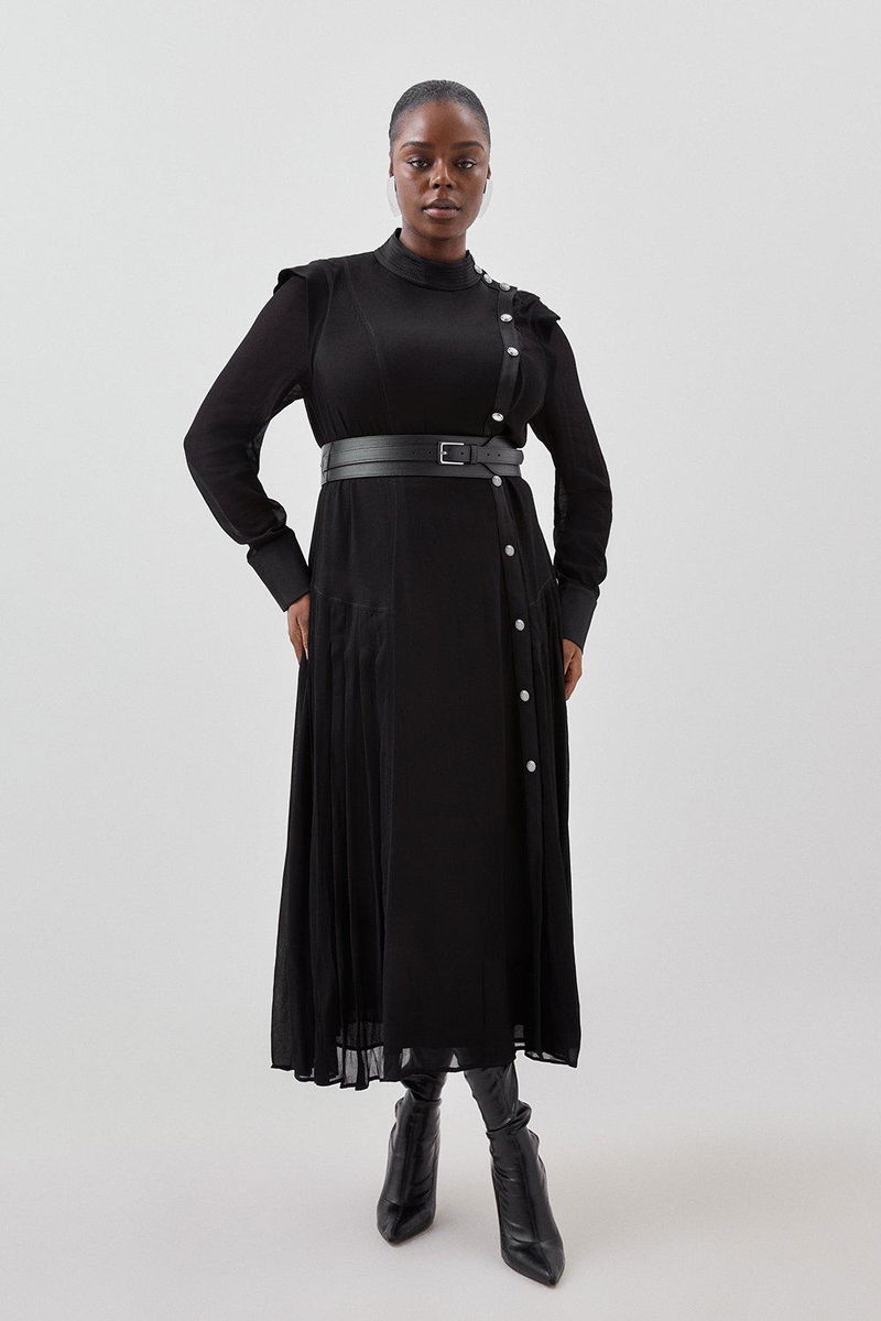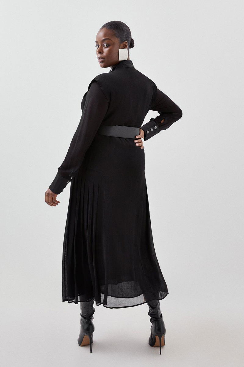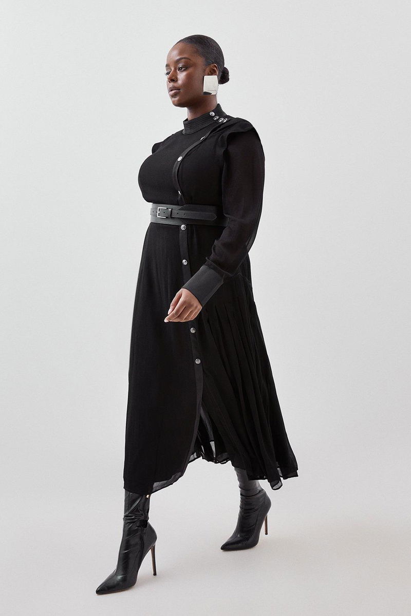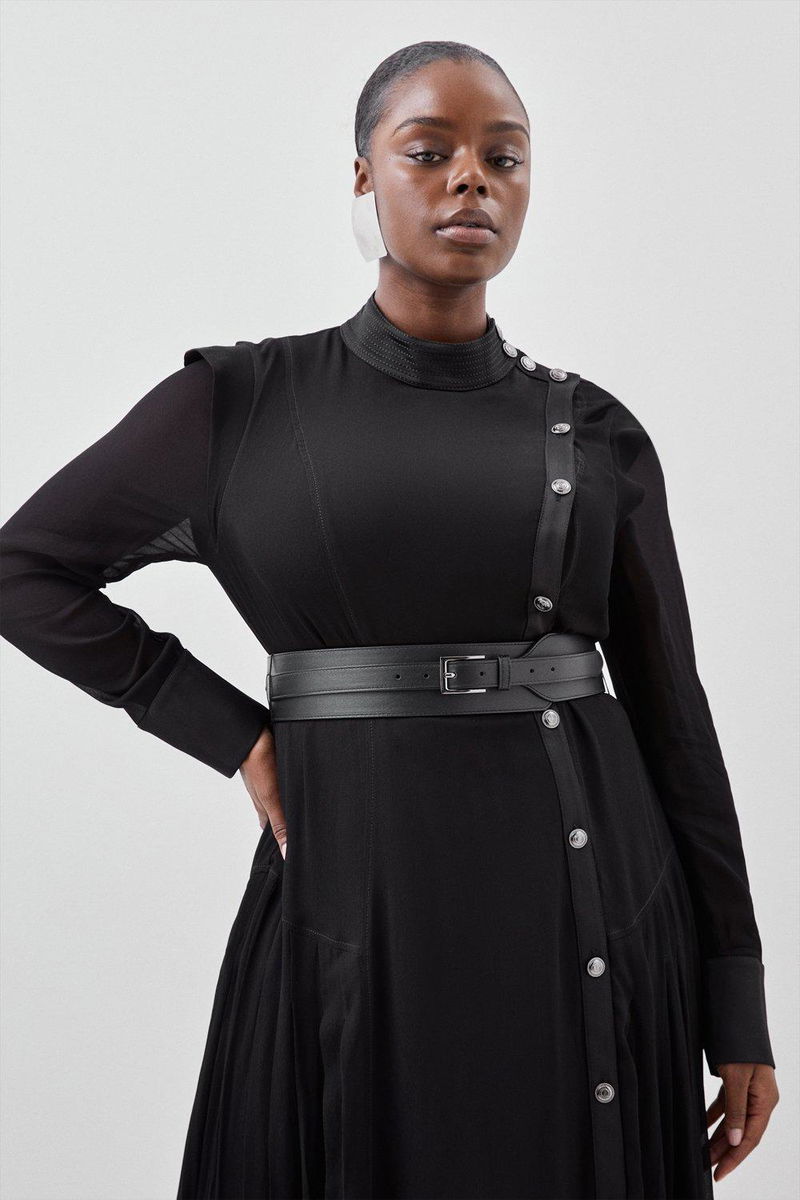 Military infuses this flowing dress, featuring a round neck with polished silver button detail the cascades from a contrasting panel. Cut by a glossy belt that cinches the waist, while a lightly pleated and sheer skirt falls to a maxi length. Pair with knee high leather boots for an ensemble that can go from day to night.