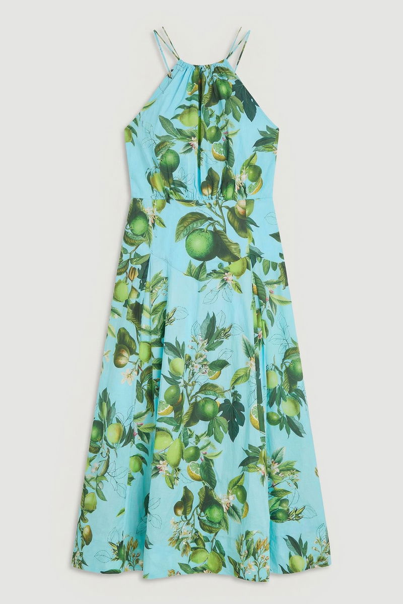 Plus Size Lime Print Cotton Halter Neck Woven Midi Dress With Dropped Waist Detail