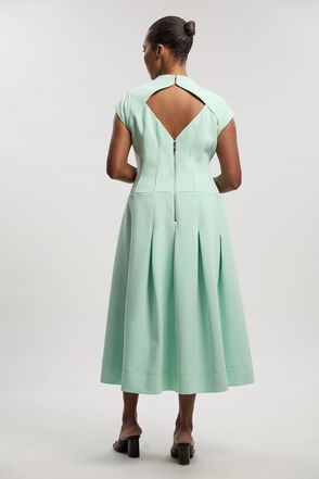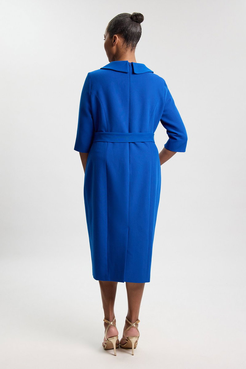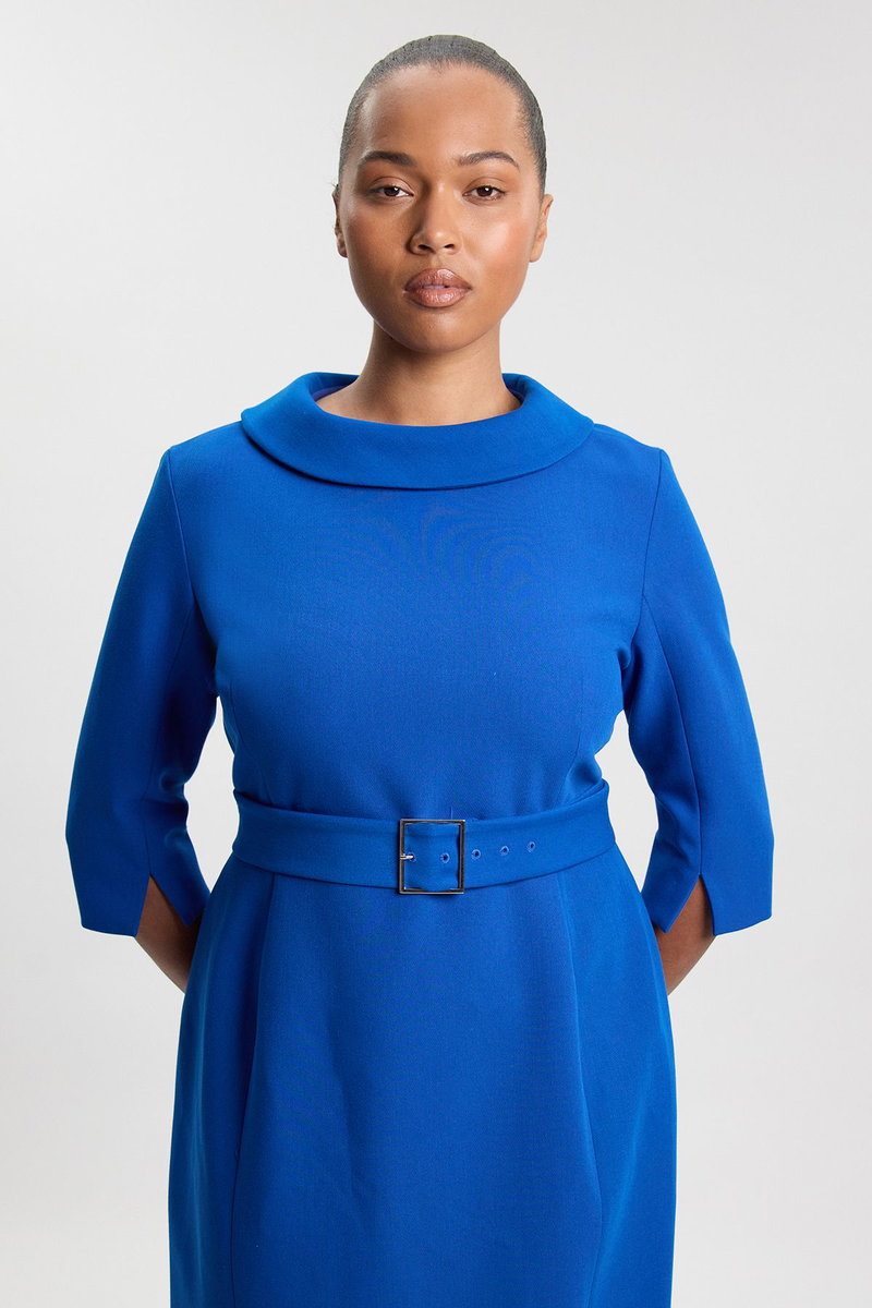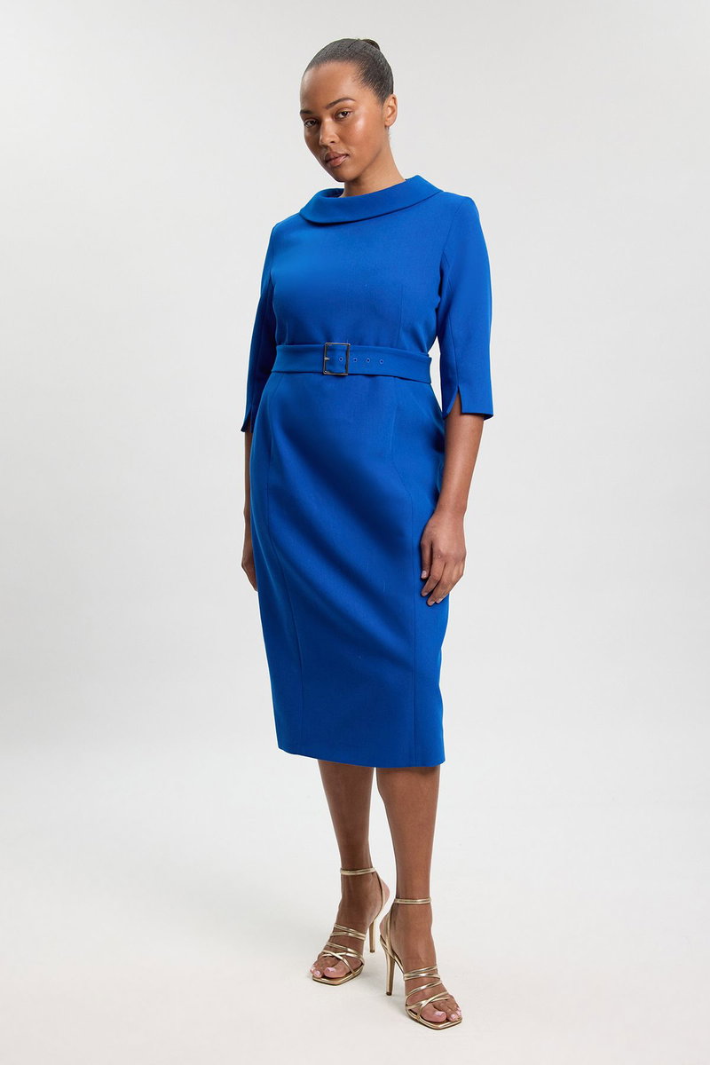 This Karen Millen tailored roll neck dress embodies contemporary sophistication with its clean lines and structured silhouette. The thoughtfully designed roll neck adds a touch of modern elegance, whilst the pencil cut creates a refined shape that works beautifully for formal occasions. Style with metallic strappy heels as shown for evening events, or pair with court shoes and a structured blazer for professional settings. The waist-defining belt enhances your natural shape, making this piece particularly flattering for special occasions such as weddings, races or important business functions. The midi length offers a timeless appeal that transitions effortlessly from day to evening, making this dress a versatile addition to your occasion wardrobe. Complete the look with minimal jewellery to maintain the dress's sophisticated aesthetic.