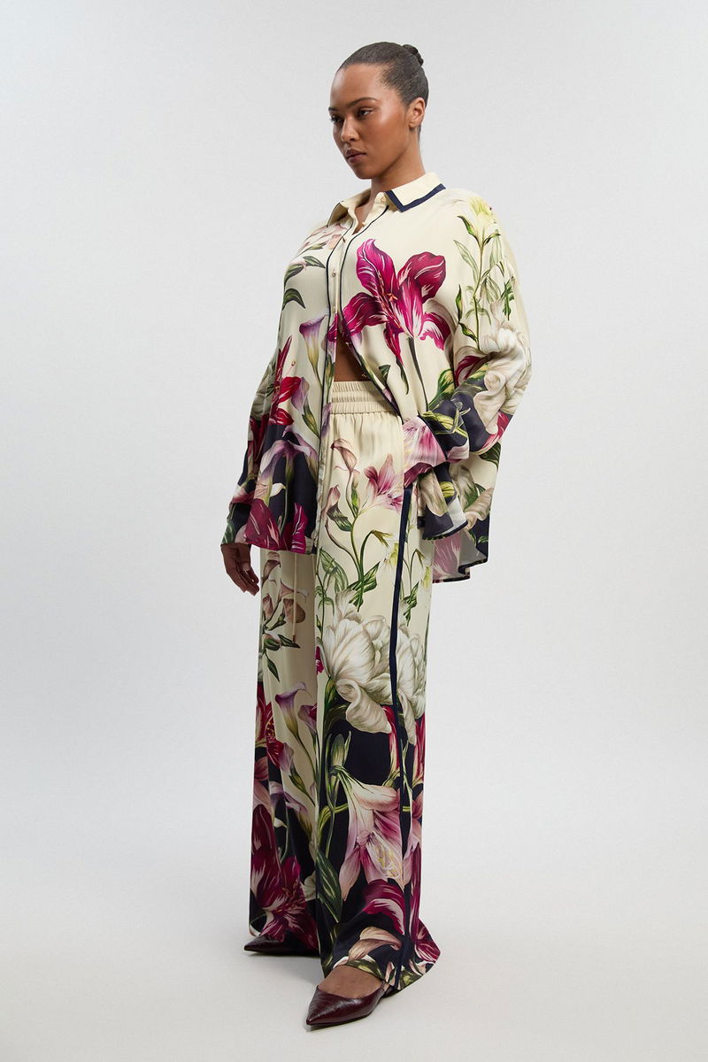 Plus Size Viscose Satin Floral Print Wide Leg Woven Trouser