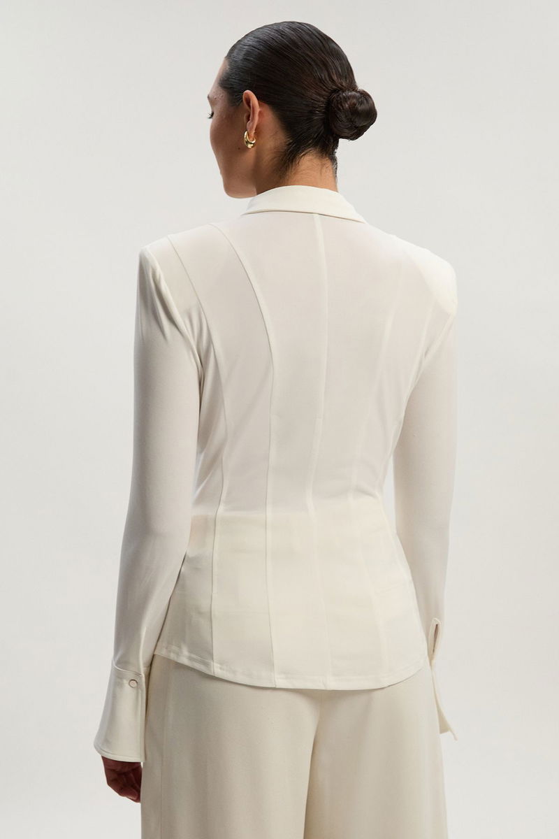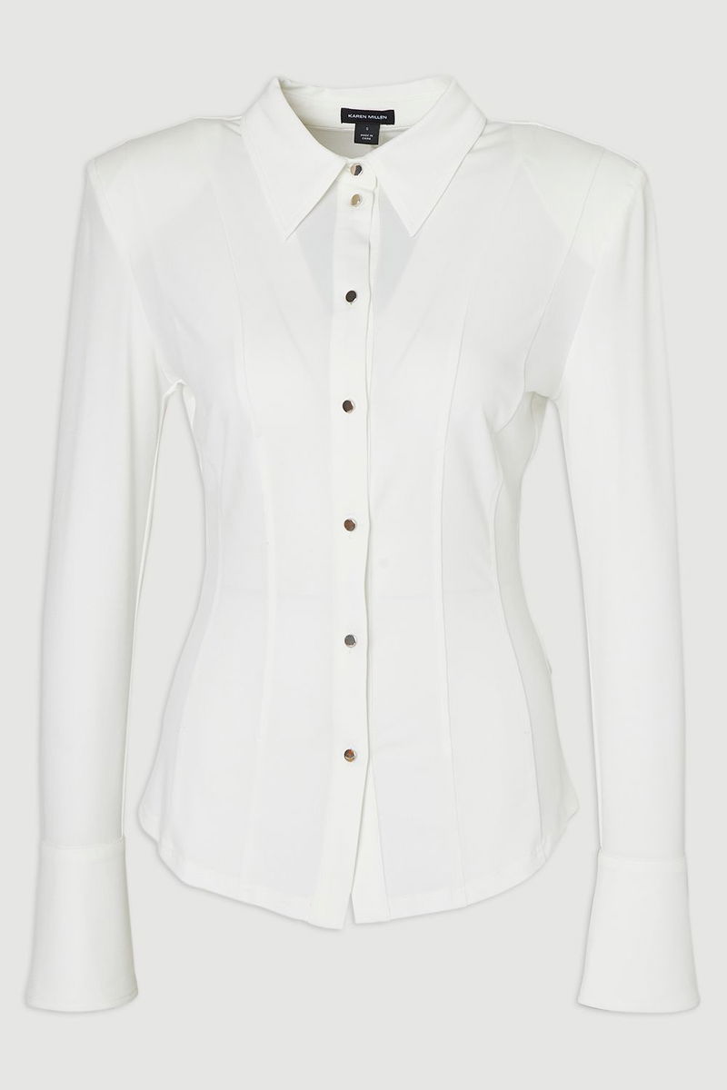 The Karen Millen Power Shoulder Drapey Crepe Shirt redefines daywear with architectural precision. The dramatic shoulder structure creates a confident silhouette, while the vertical seam detailing enhances the shirt's form-fitting design. The slim fit and structured collar maintain a polished aesthetic. This versatile piece transitions effortlessly from office to evening drinks when accessorised with statement jewellery. The button-through style offers styling flexibility; wear fully buttoned with tailored trousers for office settings, or slightly open with your favourite denim for a more casual look. Power shoulders create a bold, contemporary silhouette Drapey crepe fabric Vertical seam detailing Classic collared neckline Slim fit design