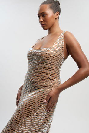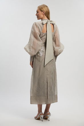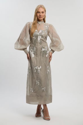 Premium Crystal Embellished Long Sleeve Plunge Neck Midi Dress