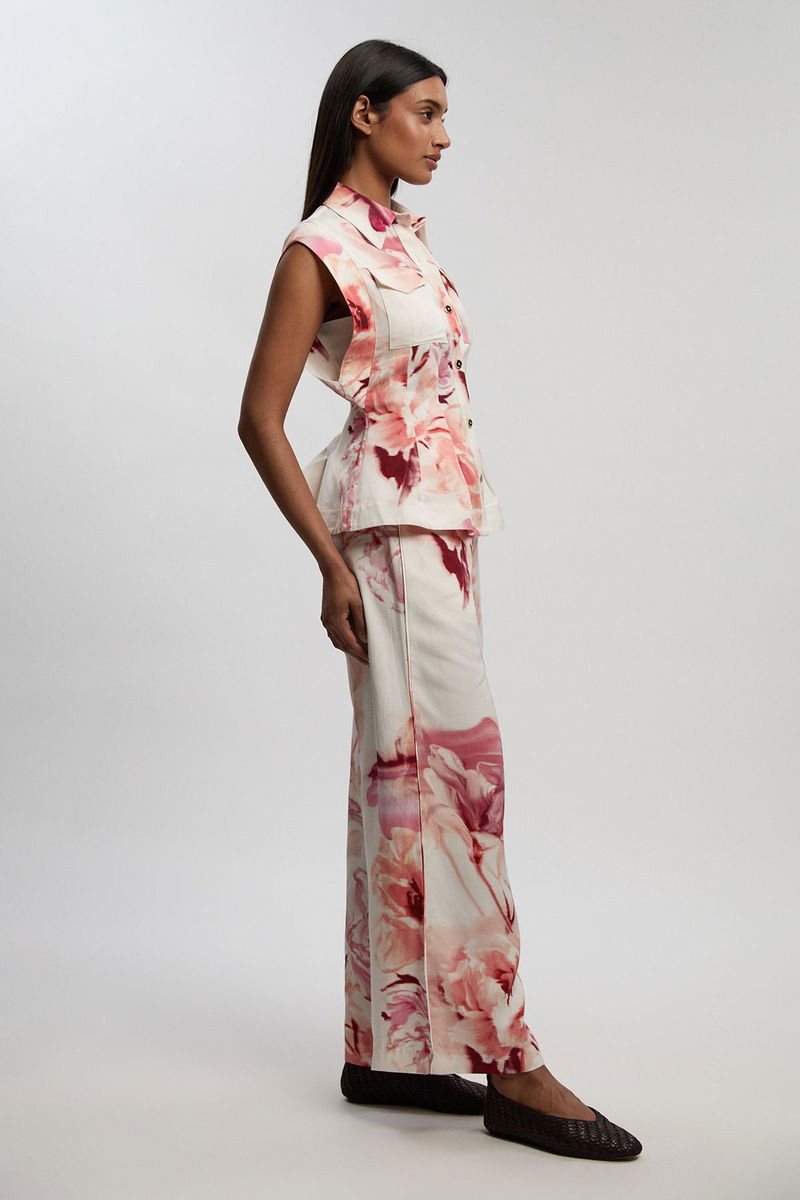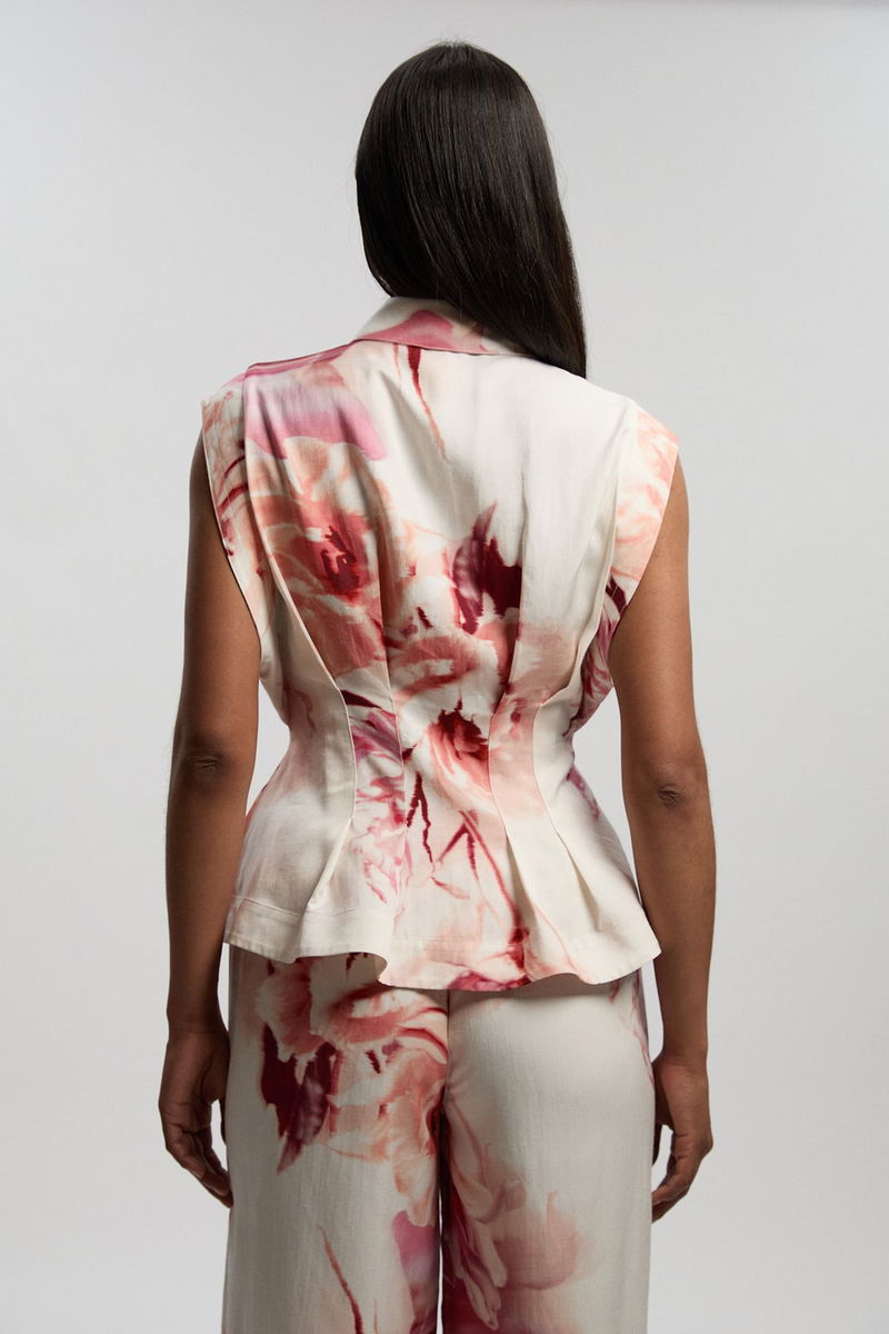Premium Viscose Linen Floral Top Stitch Woven Blouse With Waist Seam Detail