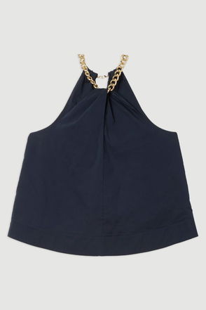 With its distinctive halterneck design, crisp collar, and boxy fit, this sleeveless shirt has a contemporary silhouette that pairs beautifully with tailored trousers, as styled on our model. The lightweight fabric drapes elegantly, gathering softly at the back for added dimension. Perfect for daytime engagements, style with wide-leg trousers and statement sunglasses for family brunches, or layer under a structured blazer for more polished casual settings. The versatile design transitions effortlessly from office to weekend, particularly when paired with slim-fit jeans and ballet flats.