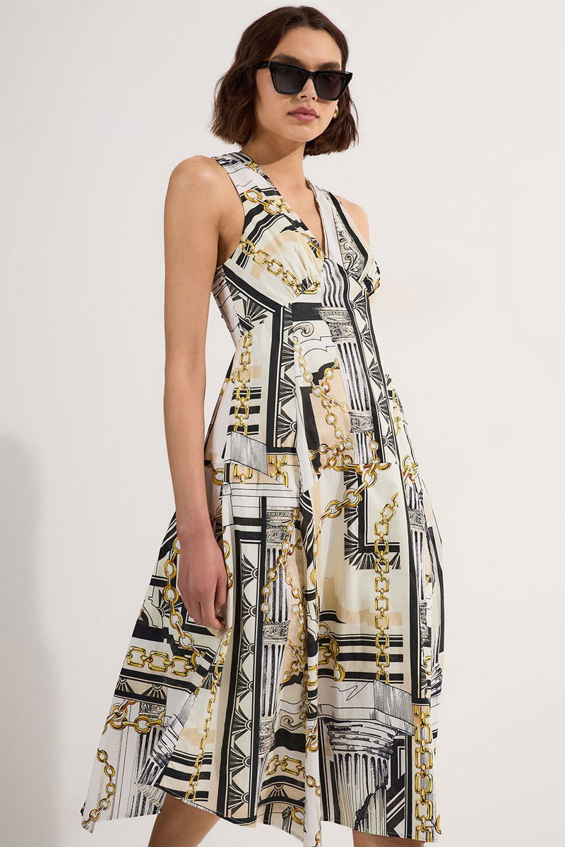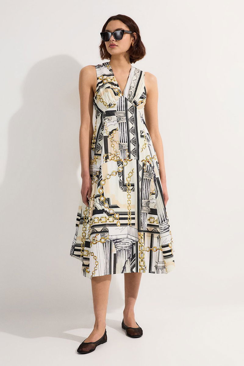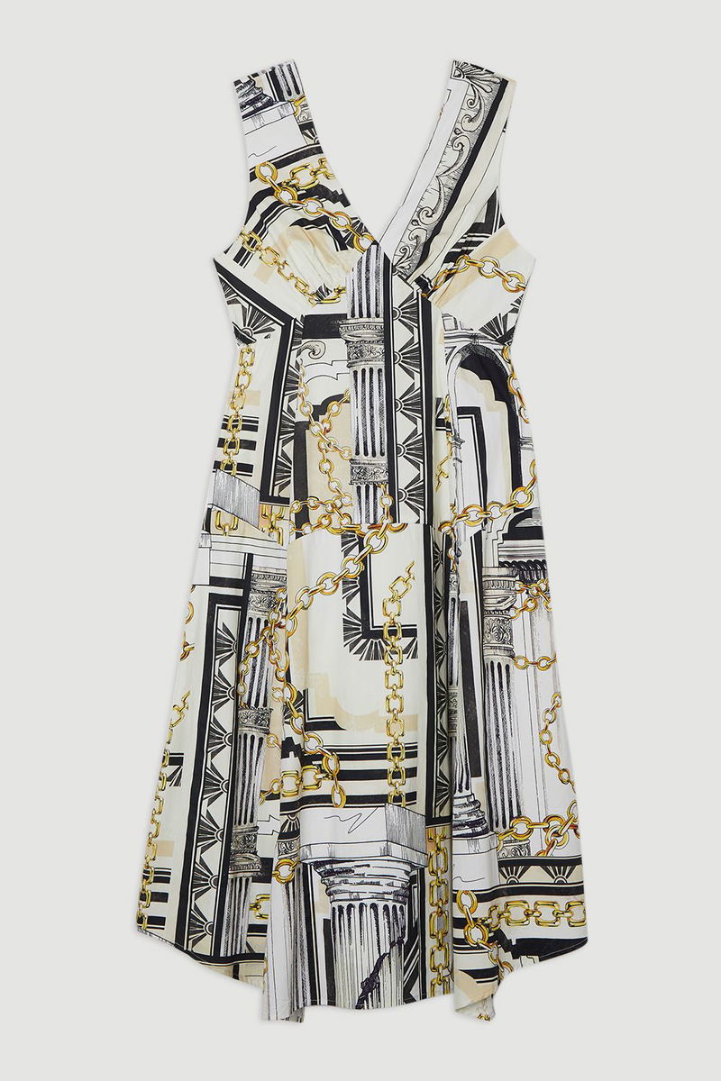 Roma Print Cotton Sateen Dipped Hem Woven Midi Dress