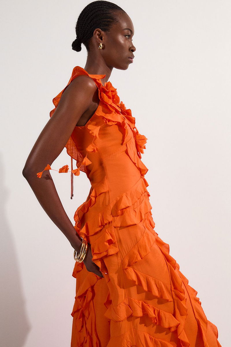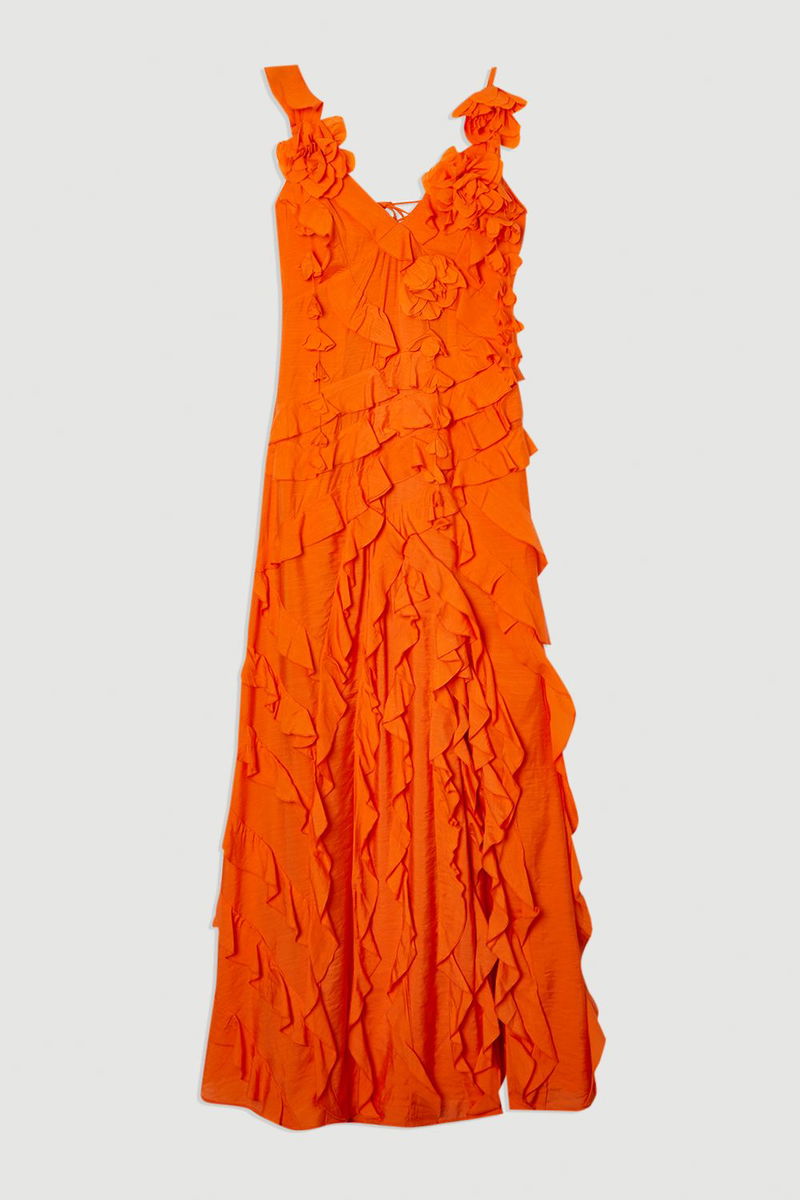 Ruffle & Applique V Front Viscose Woven Maxi Dress