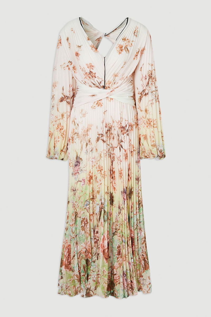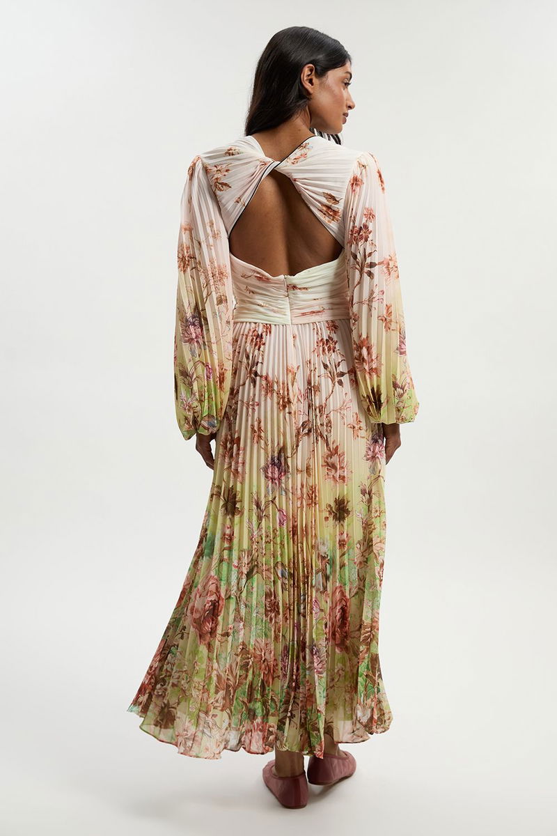 Scattered Floral Balloon Sleeve Pleated Crinkle Cut Out Woven Maxi Dress