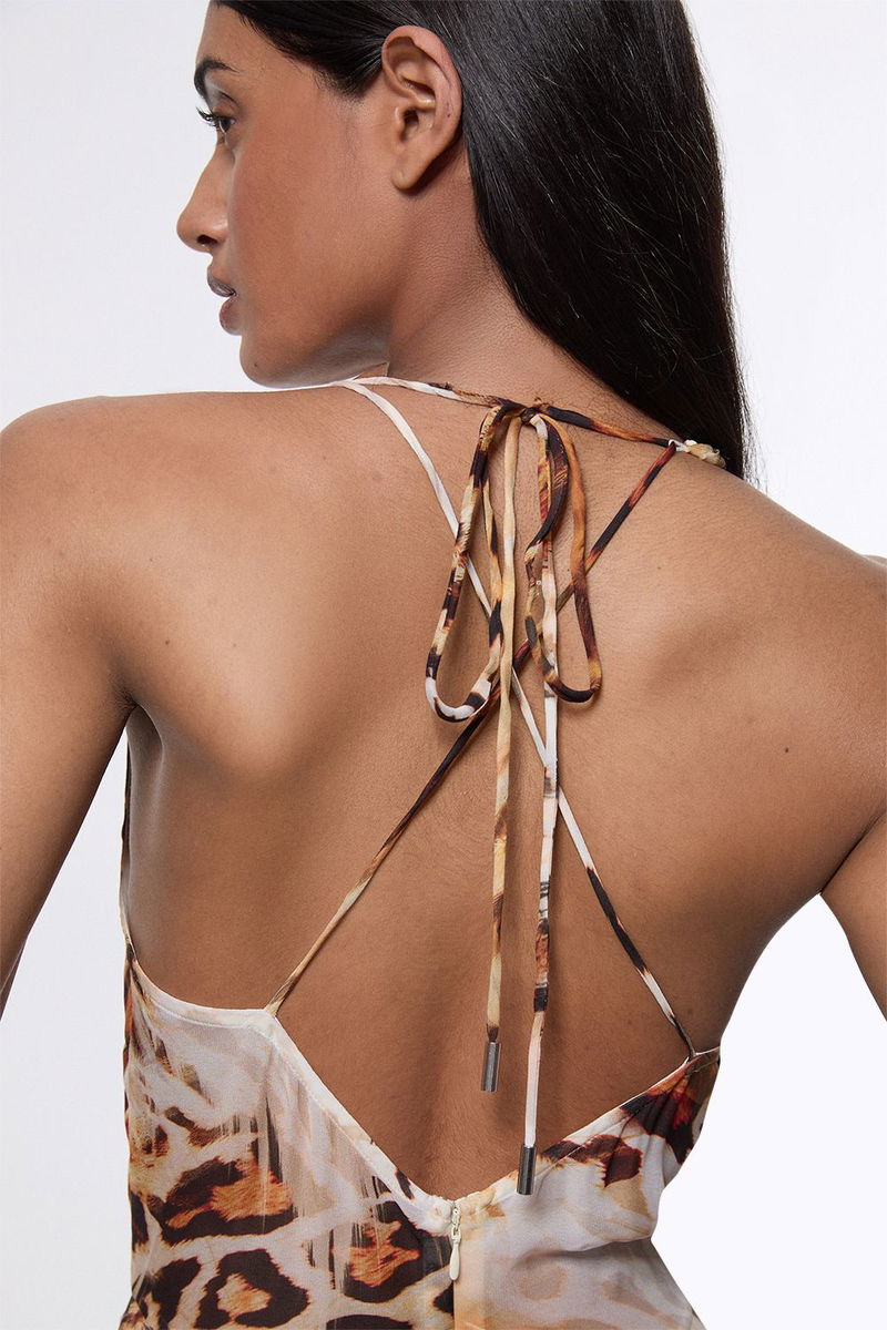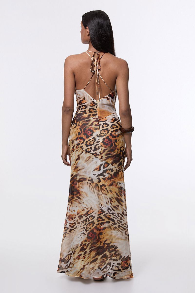Sheer Viscose Georgette Sketchy Animal Deep V Woven Halter Neck Dress