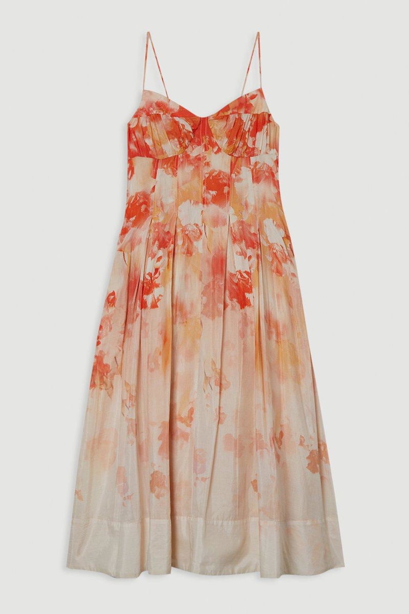 Embrace the beauty of nature with this captivating strappy midi dress from Karen Millen. The exquisite trailing floral print creates a romantic and feminine aesthetic, perfect for daytime events and casual outings. The silk-cotton blend fabric ensures a luxurious feel against the skin while offering breathability for all-day comfort. The fitted bodice and strappy neckline accentuate your figure, while the A-line skirt gracefully flows to a midi length, creating a balanced and flattering silhouette. Style this versatile piece with flat sandals and a woven basket bag for a chic garden party look, or dress it up with espadrille wedges and statement earrings for a sophisticated brunch ensemble. The dress's adaptable design makes it an ideal choice for family gatherings, outdoor festivals, or leisurely weekend brunches with friends.