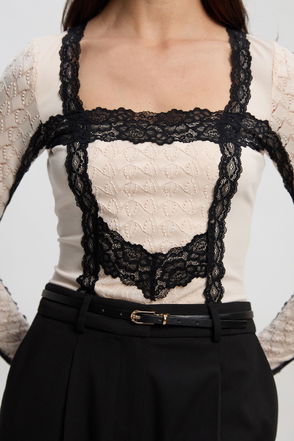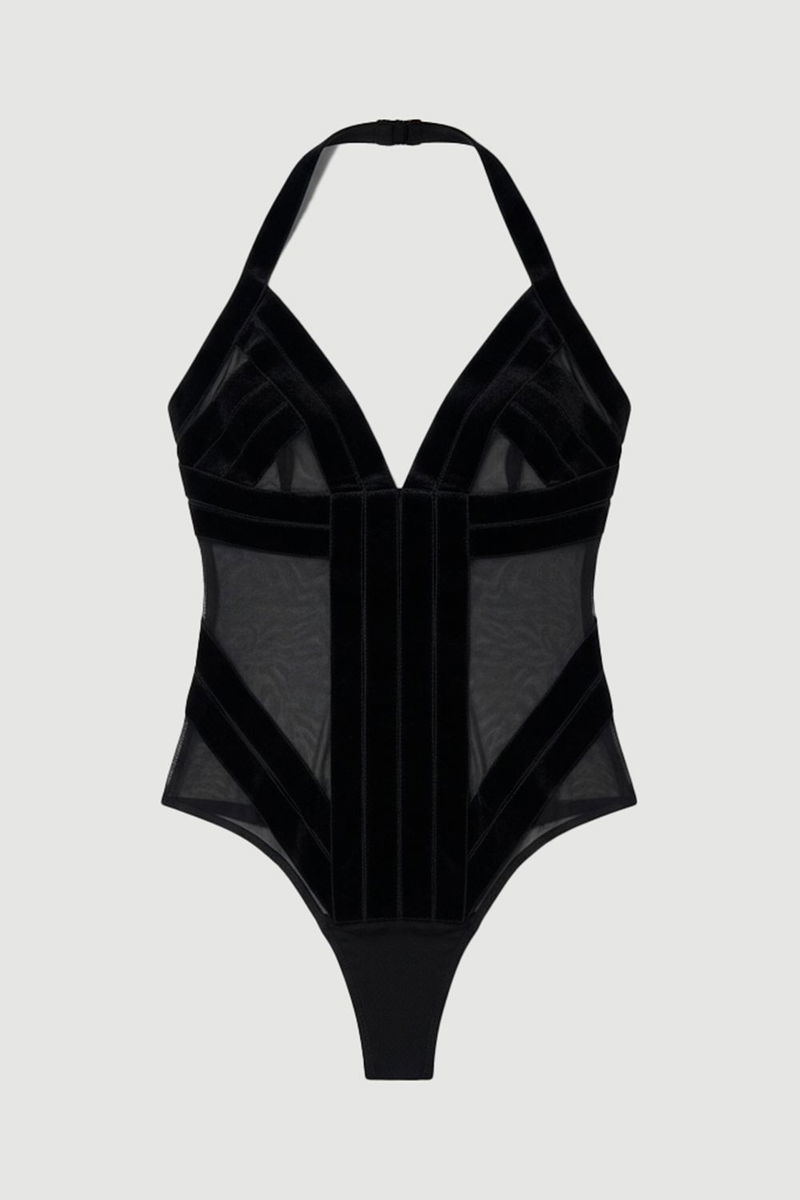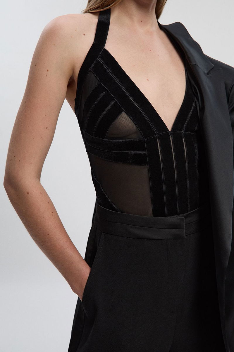 Stretch Velvet Taping Detail Mesh Sweetheart Neck Bodysuit