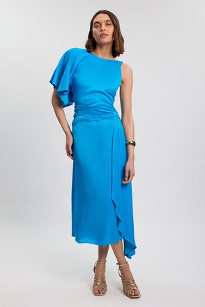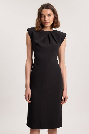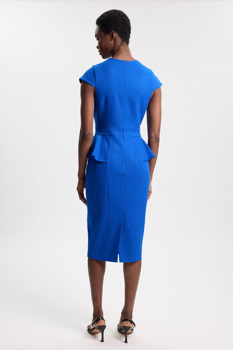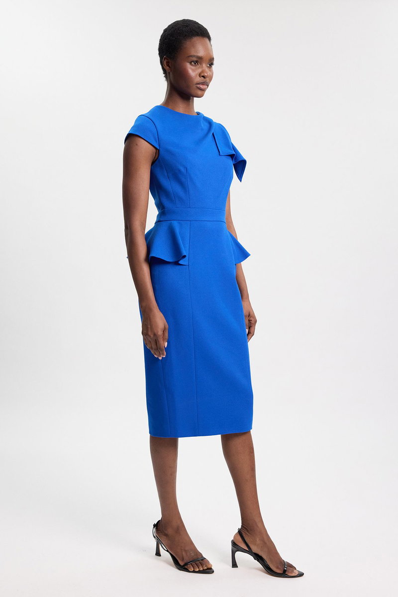 This structured midi dress exemplifies contemporary sophistication with its architectural ruched detailing and refined silhouette. The asymmetric cap sleeve creates visual interest while maintaining an elegant profile suitable for formal occasions. The defined waistline and subtle peplum detail enhance the feminine form, transitioning beautifully into the sleek pencil skirt. Style with strappy heels as shown for weddings or important business functions, or customise with a tailored blazer for corporate events. Add statement earrings and a structured clutch to complete your ensemble. Perfect for graduations, race days or evening receptions, this versatile piece demonstrates expert craftsmanship that will remain a wardrobe cornerstone for seasons to come. The Karen Millen design offers that rare combination of timeless appeal and contemporary edge that defines the truly well-dressed woman.