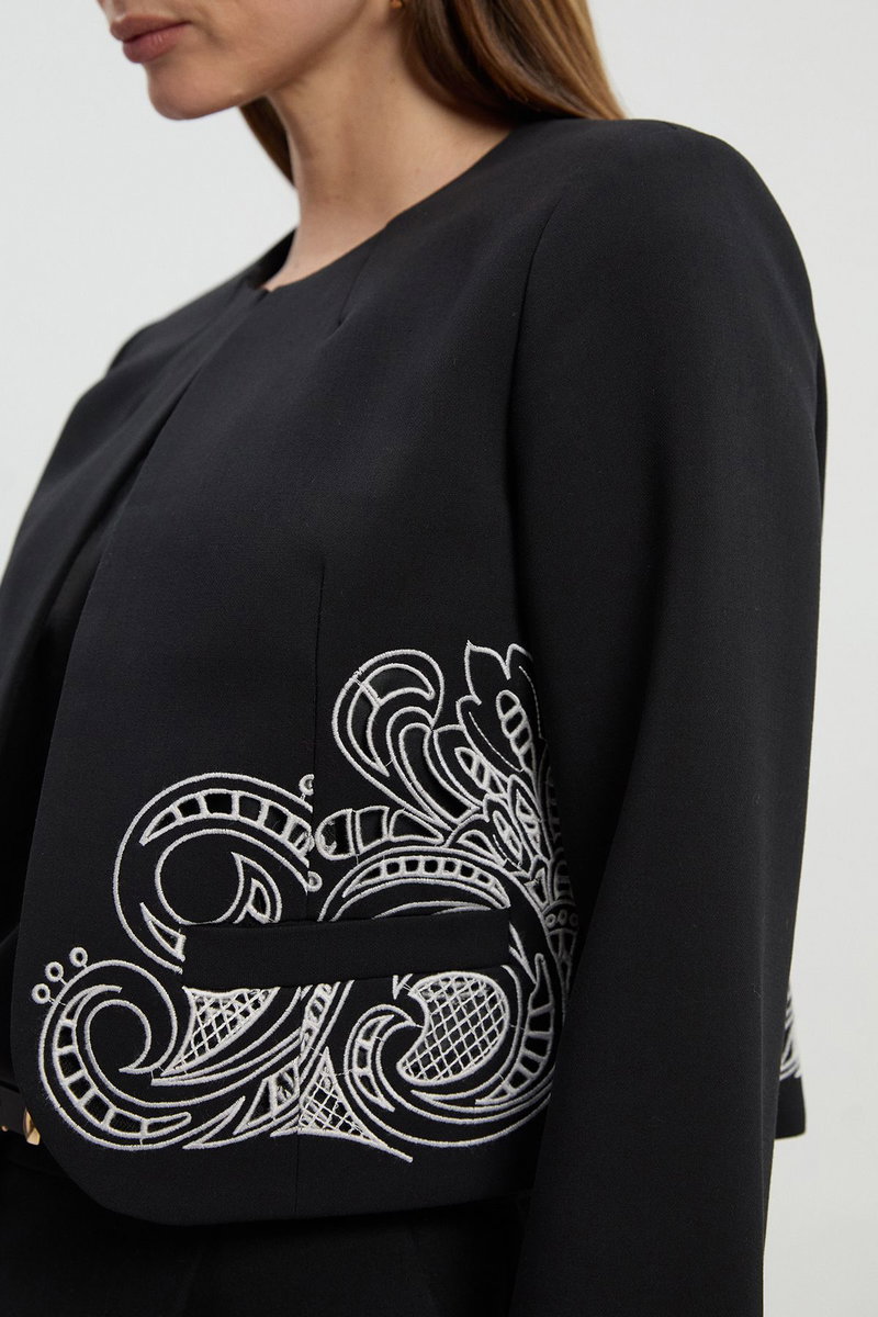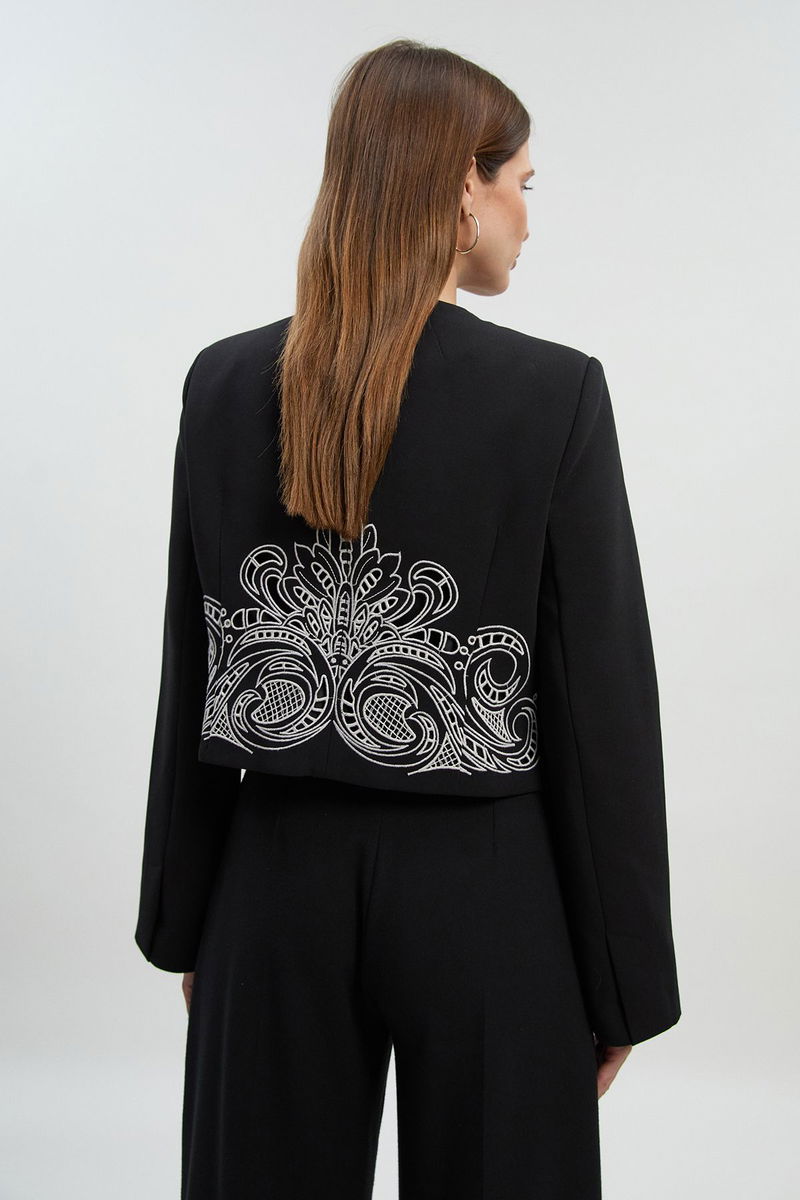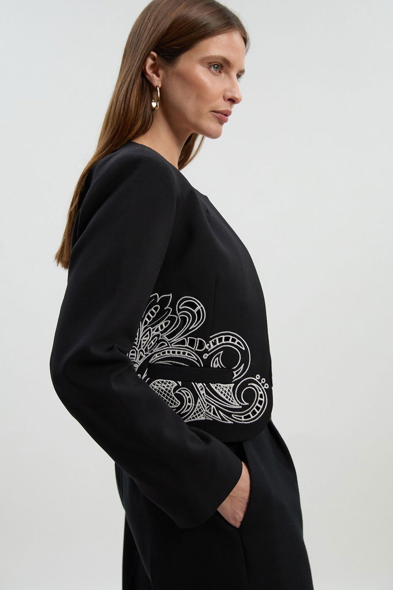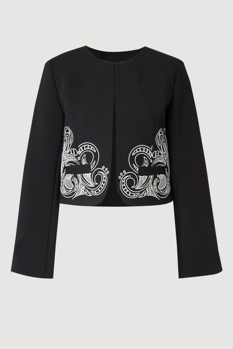 This Karen Millen tailored jacket redefines formal dressing with its refined collarless neckline and exquisite cutwork embroidery detail. The clean lines and structured silhouette create a polished look whilst the intricate sleeve detailing adds a touch of artistic sophistication. Style with tailored trousers and a silk camisole for important business meetings, or pair with a sleek pencil skirt for formal events. For weddings and race day occasions, complement with statement earrings as shown and a coordinating clutch. The regular fit ensures comfort throughout the day whilst maintaining that sharp, put-together aesthetic that defines the modern professional wardrobe. This jacket represents the perfect balance of contemporary design and timeless craftsmanship-a versatile investment piece that will serve as the cornerstone of your occasion wardrobe for seasons to come.