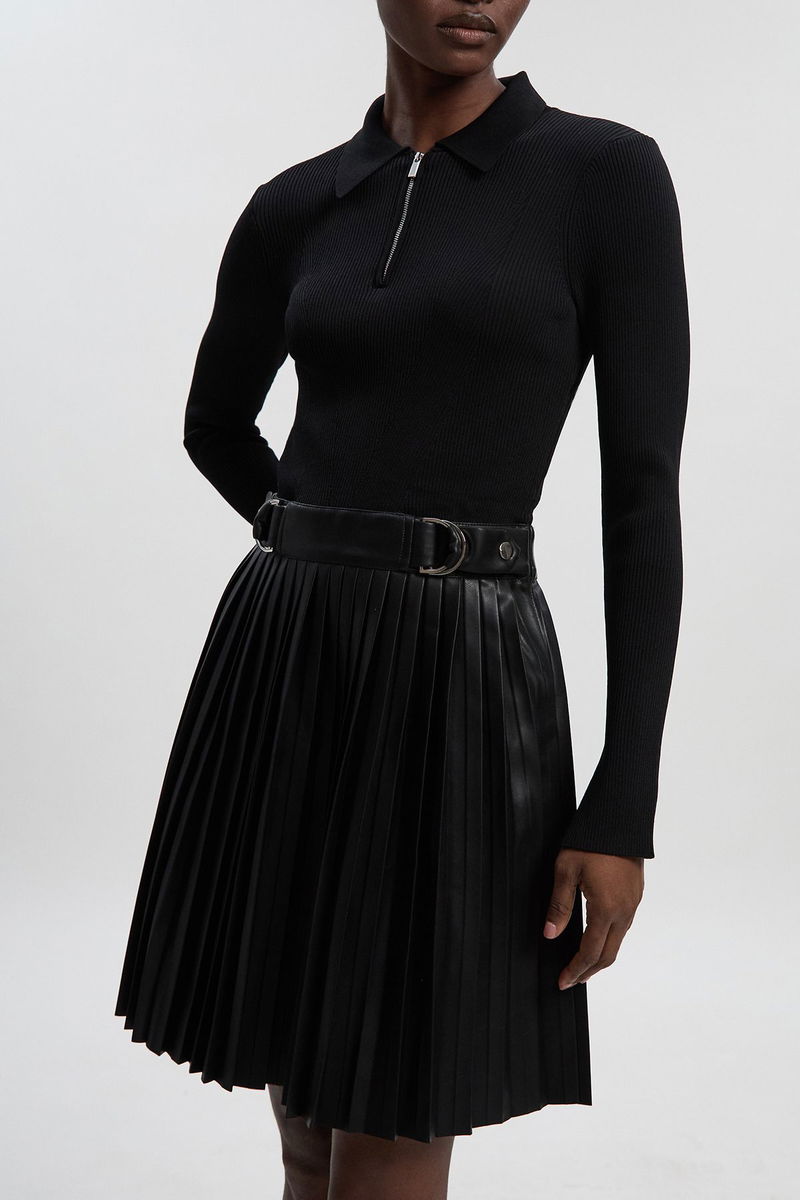 Tall Knitted Zip Neck Pu Mix Pleated Mini Dress